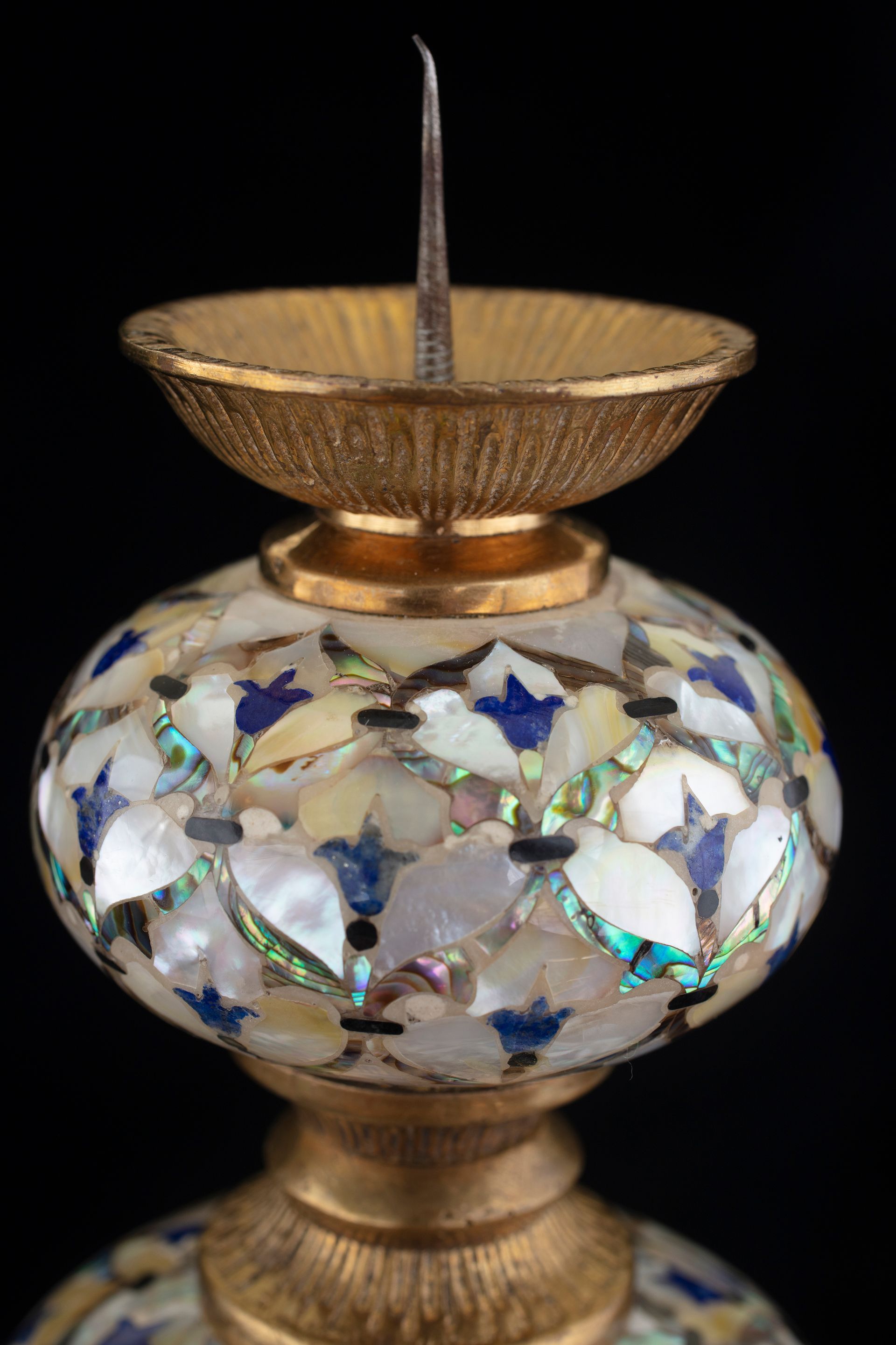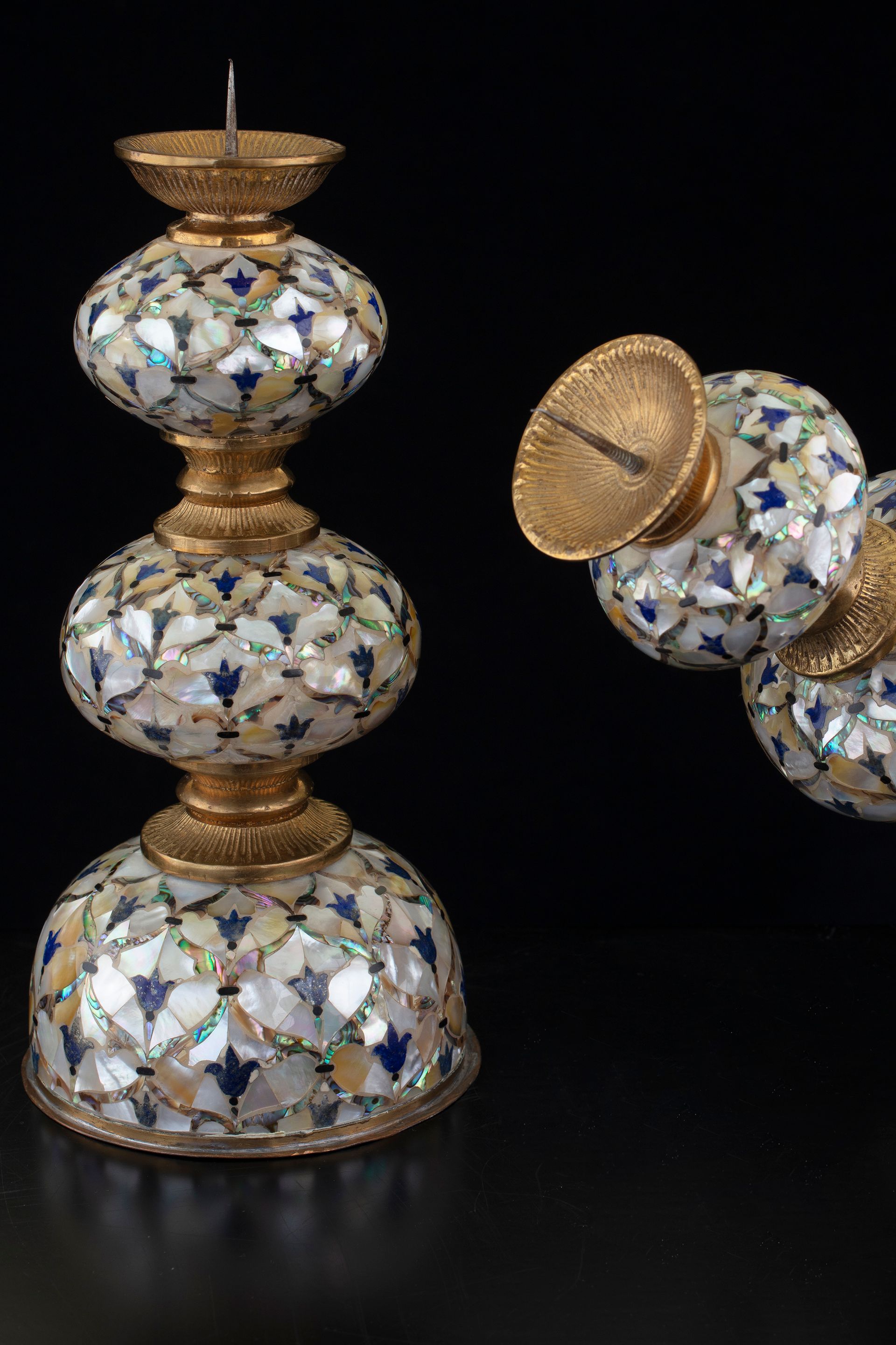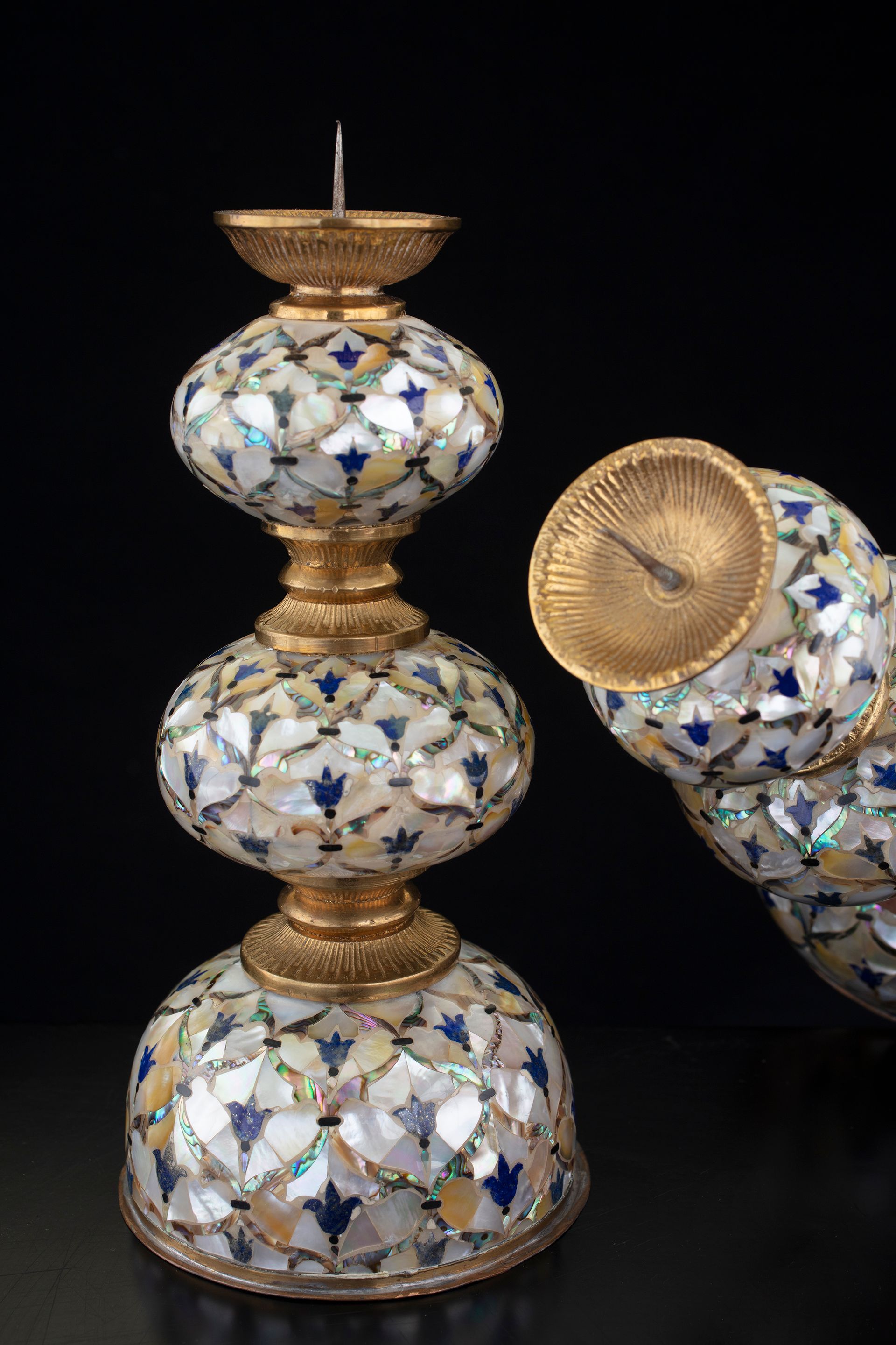 I due candelabri, impreziositi da madreperla e lapis, sono un finissimo esempio di oggetto da Wunderkammer. La forma e i motivi decorativi non rimandano a esemplari conosciuti, suggerendo la committenza di un collezionista occidentale ad una manifattura turca.