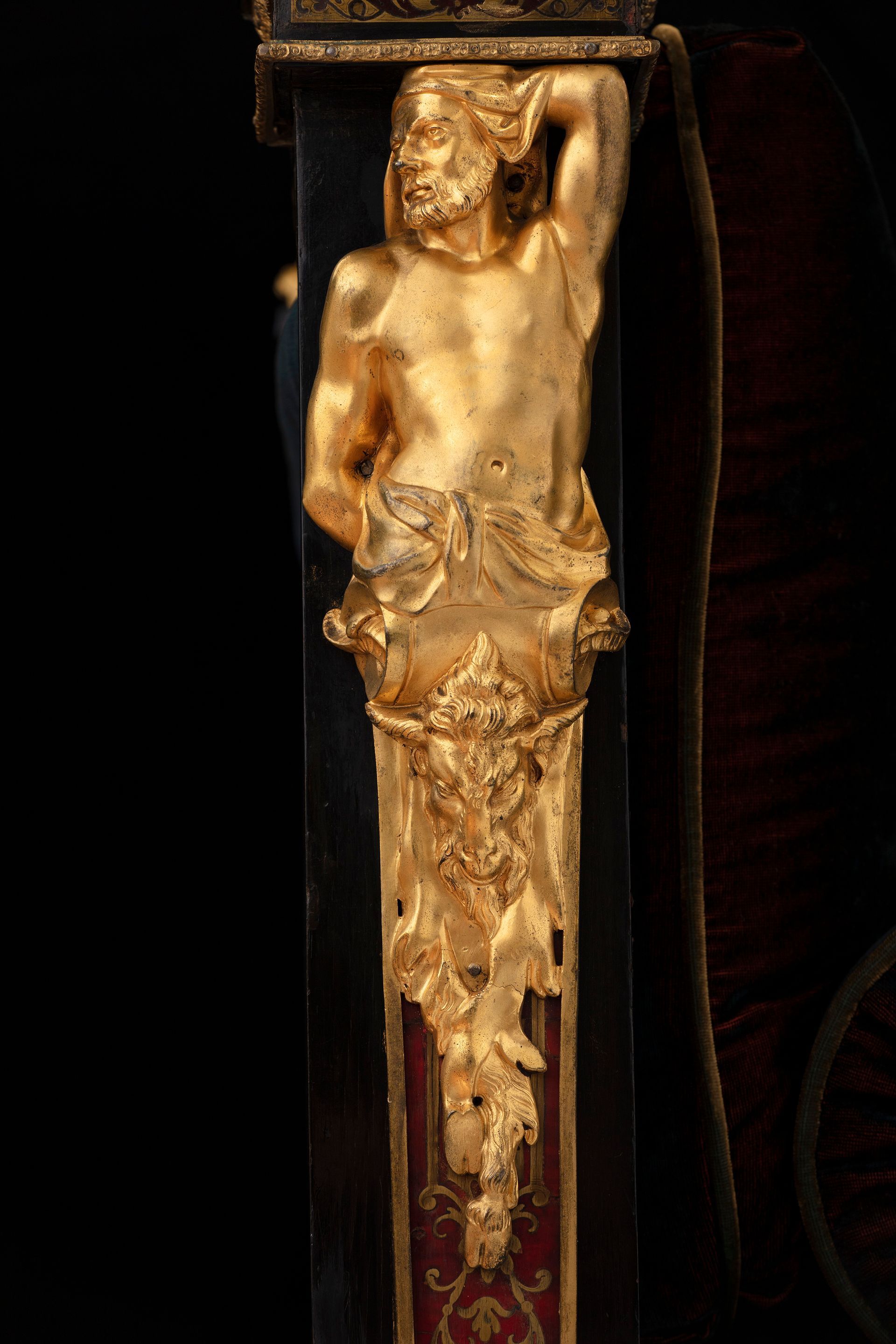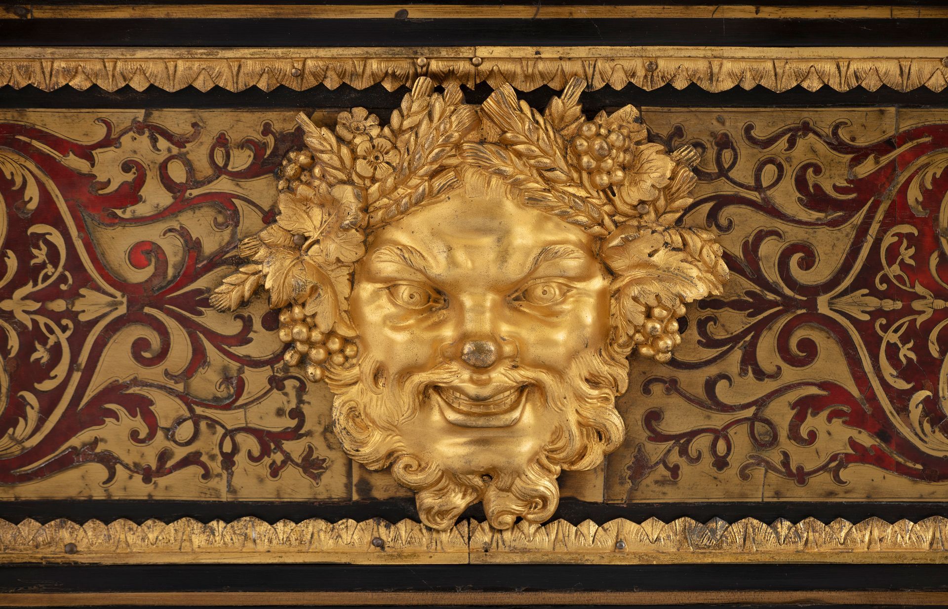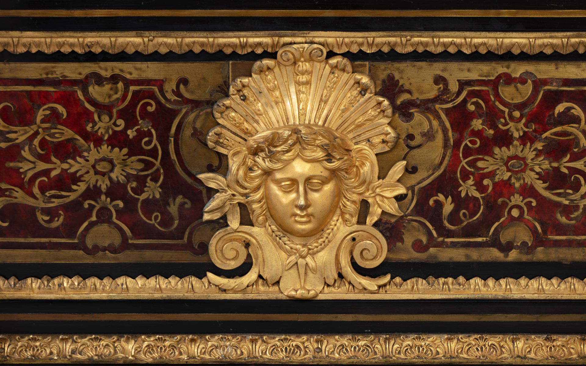Il sontuoso divano, realizzato in ebano laccato e dorato, è uno squisito esempio di manifattura francese della bottega Boulle. La fama dei mobili Boulle comincia con il lavoro del capostipite della famiglia, André-Charles; costui, ebanista alla corte del Re Luigi XIV, rese popolare il suo stile, associandolo al proprio nome, e affidò l’atelier ai figli.