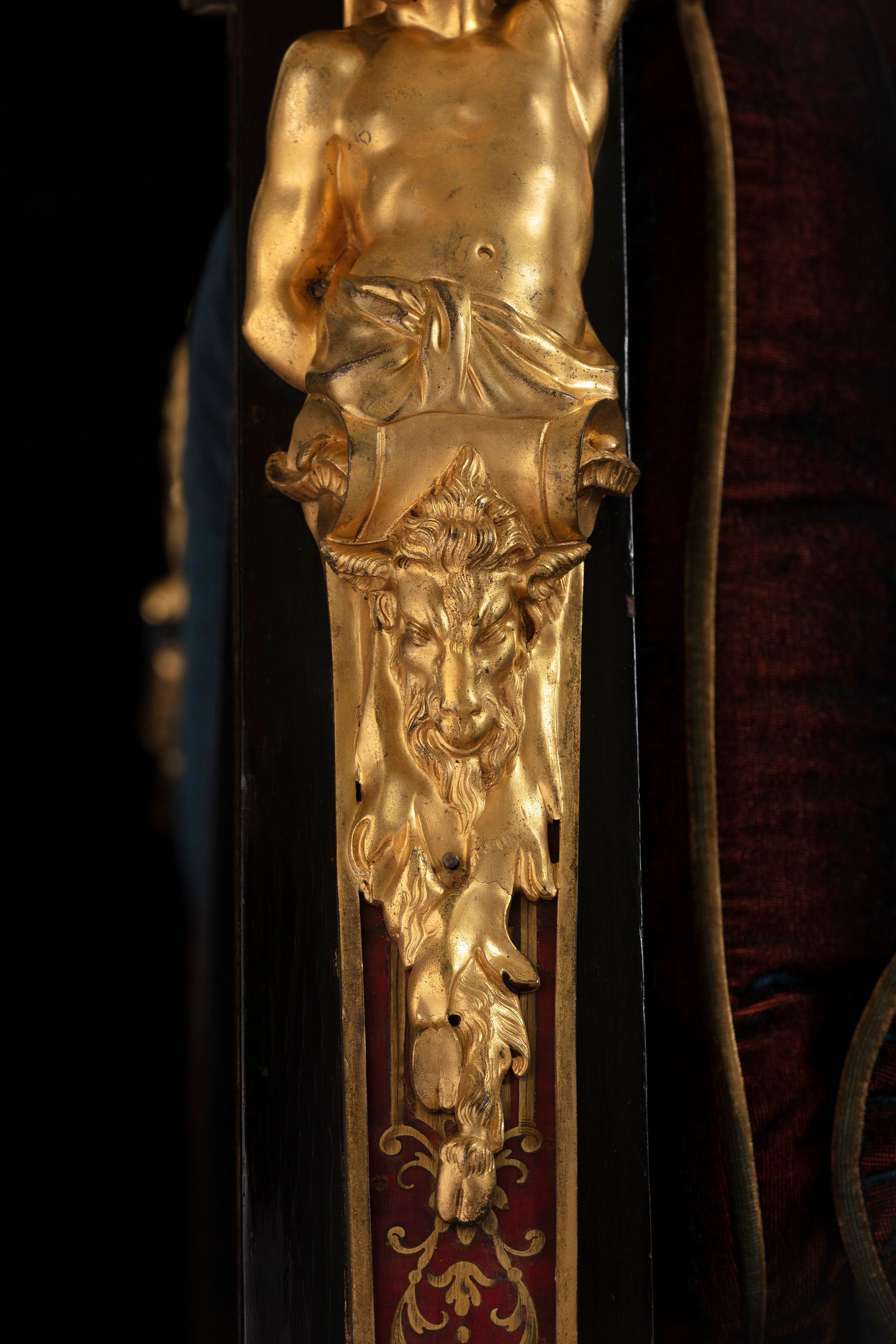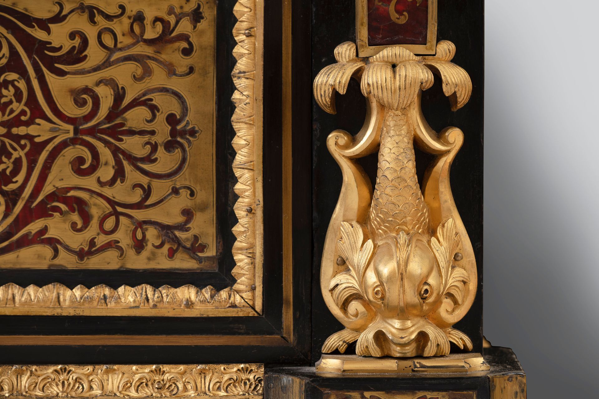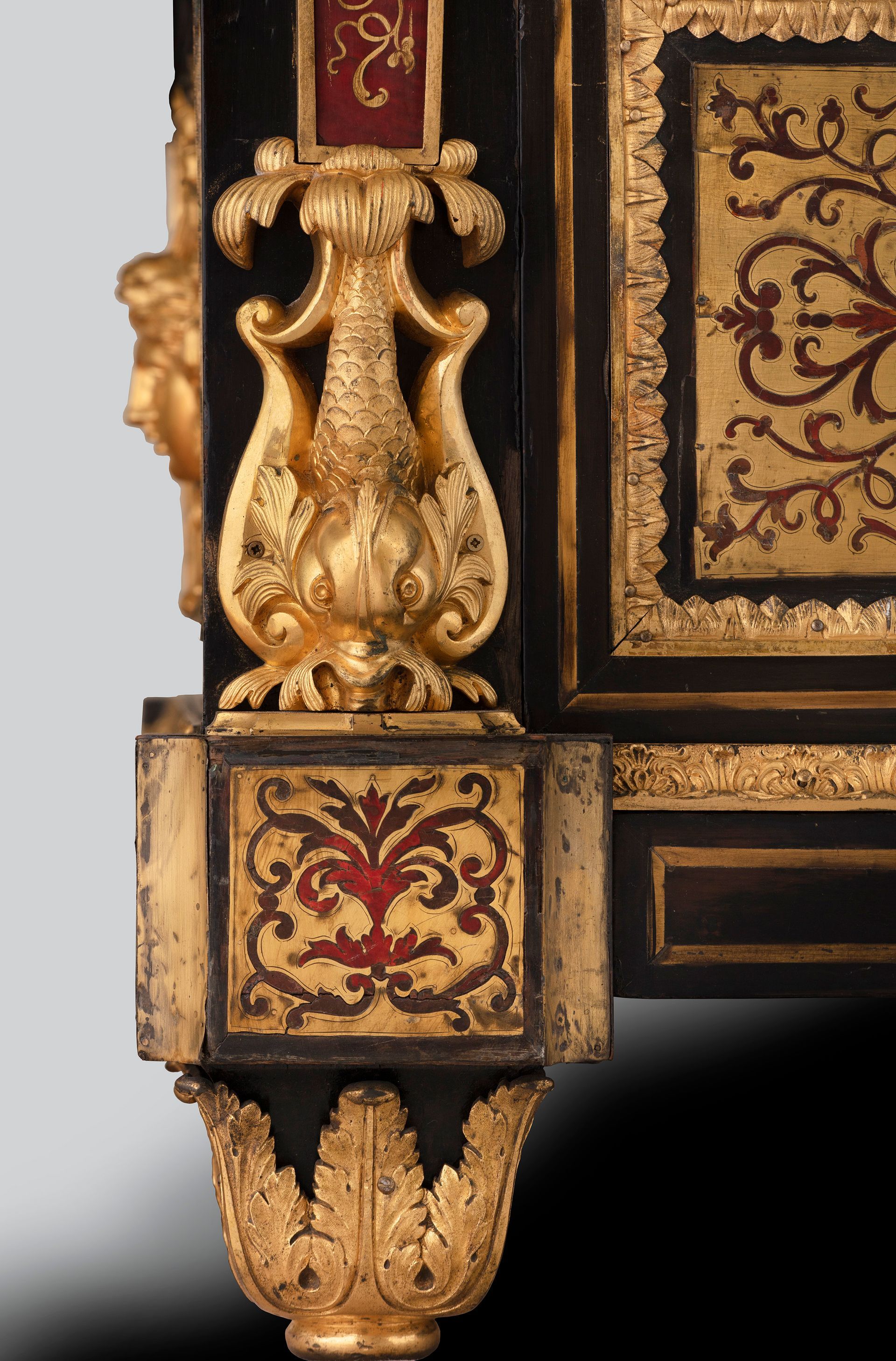 Il sontuoso divano, realizzato in ebano laccato e dorato, è uno squisito esempio di manifattura francese della bottega Boulle. La fama dei mobili Boulle comincia con il lavoro del capostipite della famiglia, André-Charles; costui, ebanista alla corte del Re Luigi XIV, rese popolare il suo stile, associandolo al proprio nome, e affidò l’atelier ai figli.