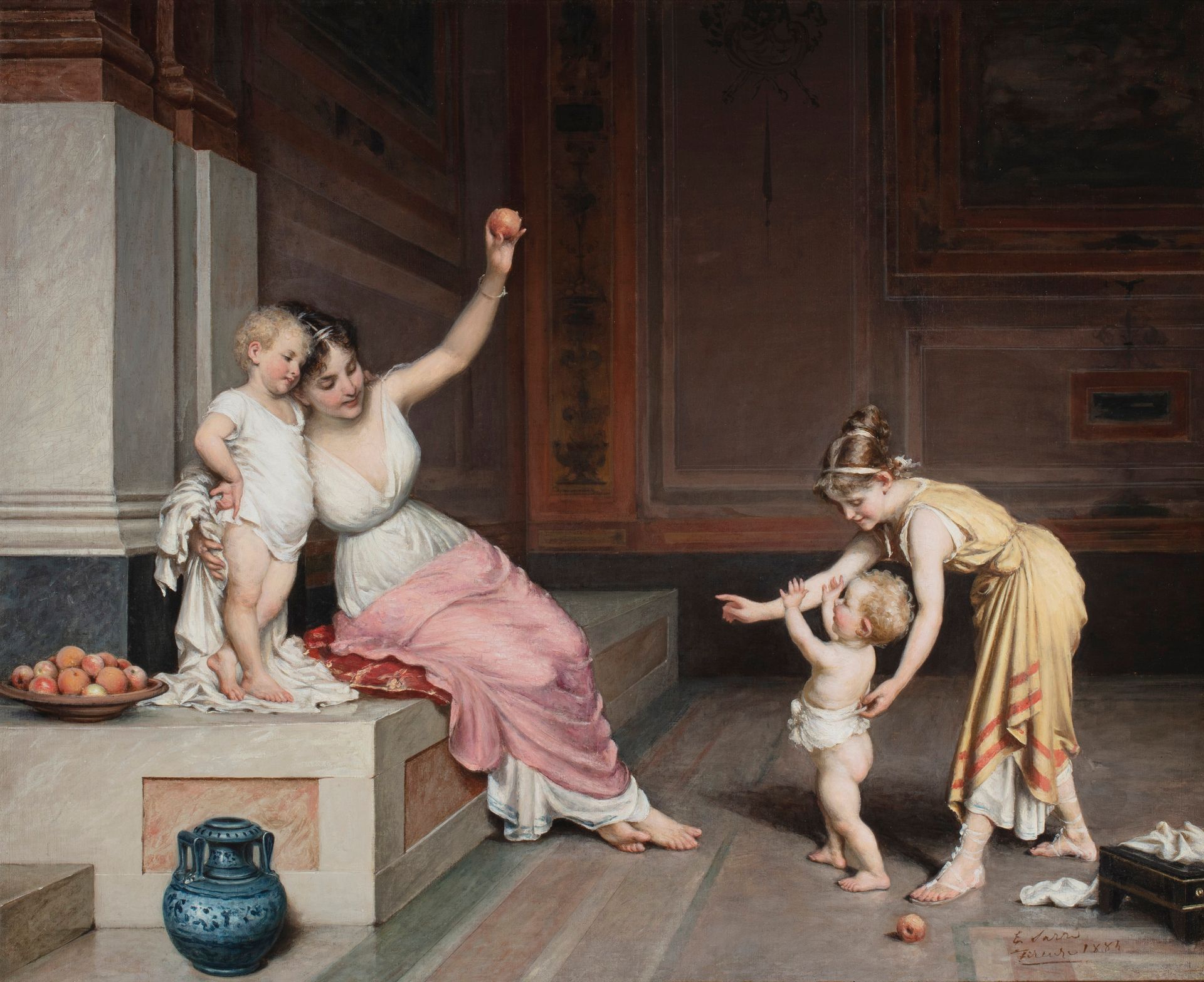 Il pargoletto agita verso l’alto le manine paffute con l’intento di afferrare il frutto, e nel mentre muove passi timidi ed incerti; le dita della giovanissima ancella, riconoscibile per i sandali “a schiava”, reggono il piccolo da un lembo di stoffa. Accanto alla madre e con fare quasi risoluto, un fanciullo poco più grande guarda la scena.