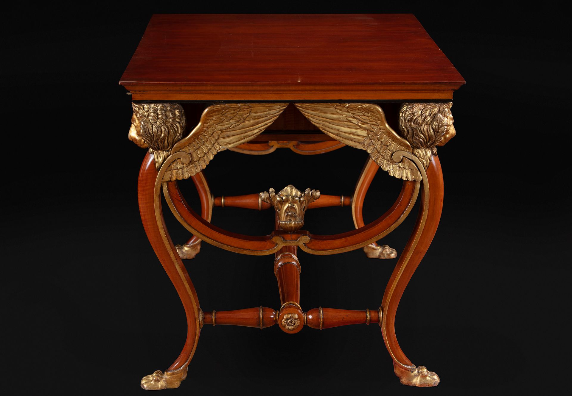 Il piano poggia su un'imponente fascia sottopiano baccellata. Il mobile è sostenuto da quattro gambe, arcuate en jarret e rifinite con una profilatura dorata, che terminano in alto con teste di leone alate e in basso con possenti zampe ferine, che donano stabilità visiva e fisica. L'intaglio è tipico delle grandi committenze pubbliche veneziane. Le grandi ali spiegate, che seguono la curva della gamba, conferiscono al tavolo uno slancio ascensionale che bilancia la gravità del suo volume. Il mobile è completato a due cassetti realizzati con un’elegante lavorazione a scanalatura.