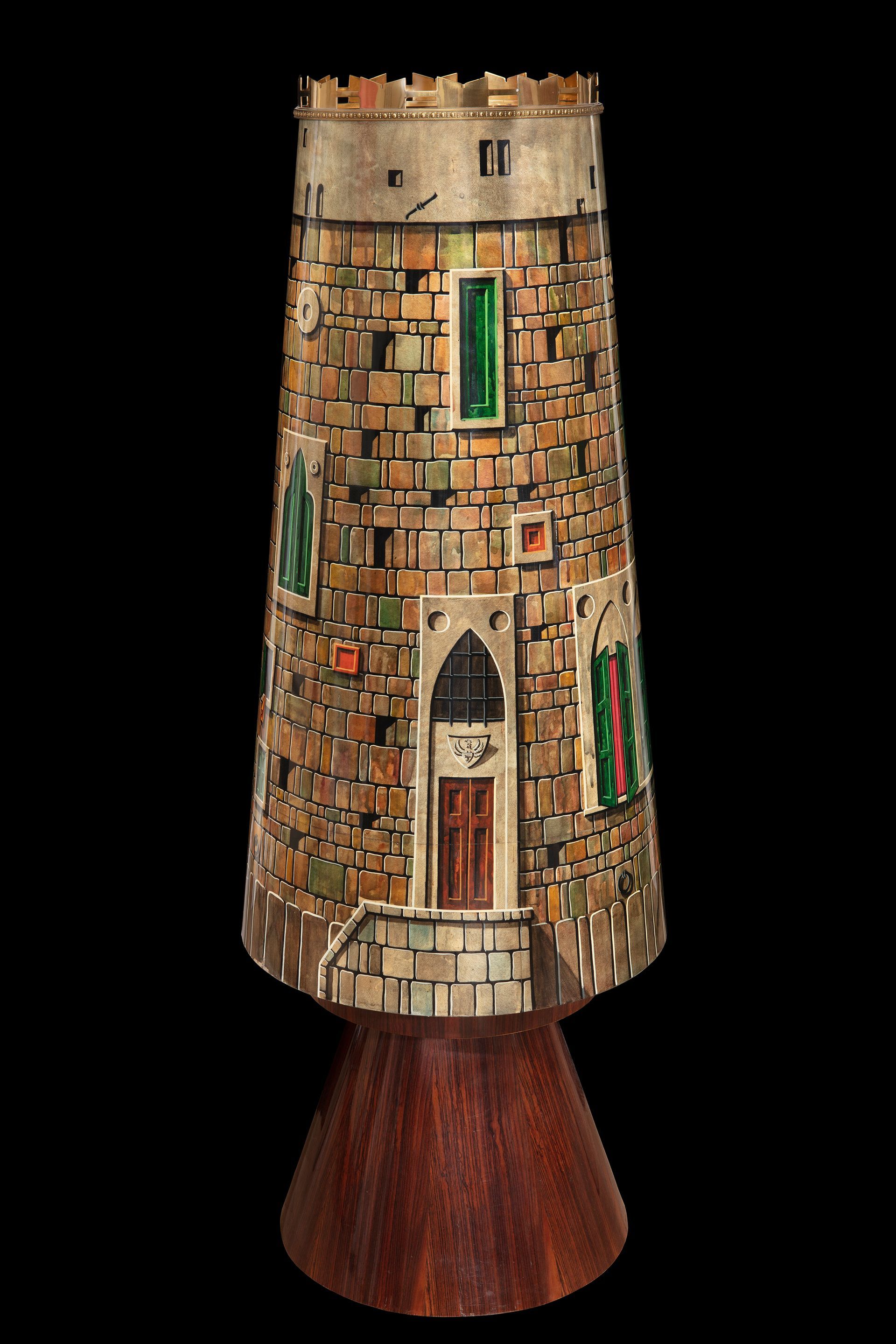 Il mobile, dalla curiosa forma quasi conica, è decorato dal disegno di un palazzo gotico veneziano dai toni bruni e le persiane verde acceso; la sommità culmina con un ornamento merlato in ottone che ricorda quello dei castelli medievali. Dal design ecclettico e innovativo, all’interno presenta tre ripiani in vetro e un meccanismo che permette l’accensione di una lampada ogni qualvolta il mobile venga aperto.