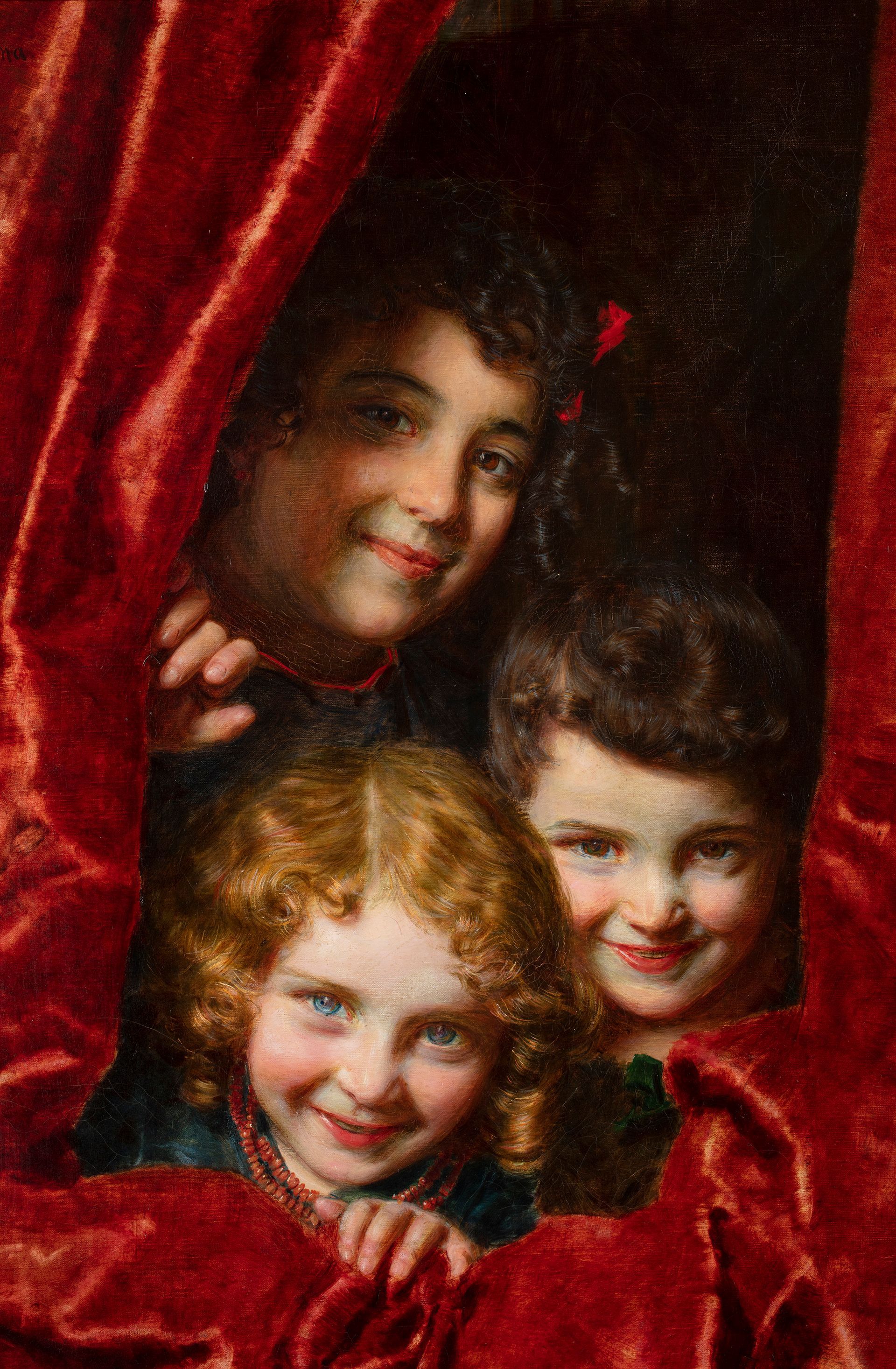 Dietro il sipario è uno splendido e giocoso dipinto dell’artista modenese Gaetano Bellei; la pennellata fuggente e rapida, quasi divisionista e la scelta del soggetto fanciullesco la rendono un’opera emblema dello stile del pittore. Tre bambine si nascondono dietro una pesante tenda di velluto rosso e nel mentre guardano l’osservatore con occhietti divertiti: sembra quasi di poter udire le risate argentine uscire dalle loro bocche rosate e distese in teneri sorrisi. Bellei lascia trasparire, tramite le pose e gli sguardi, il carattere delle protagoniste: la bimba in primo piano, con la sua chioma bionda miele e luminosi occhi celesti, è probabilmente la più piccola e la più vivace; la sua coetanea a destra, dai ricci castani che le cadono sulla fronte, rimane in secondo piano, quasi come se fosse complice dello scherzo ideato dalla prima. In alto a sinistra, la ragazzina dai bei ricciolini quasi neri ha un sorriso più composto e “a modo”, come se avesse un portamento più serio, che ci si aspetta da una sorella maggiore.