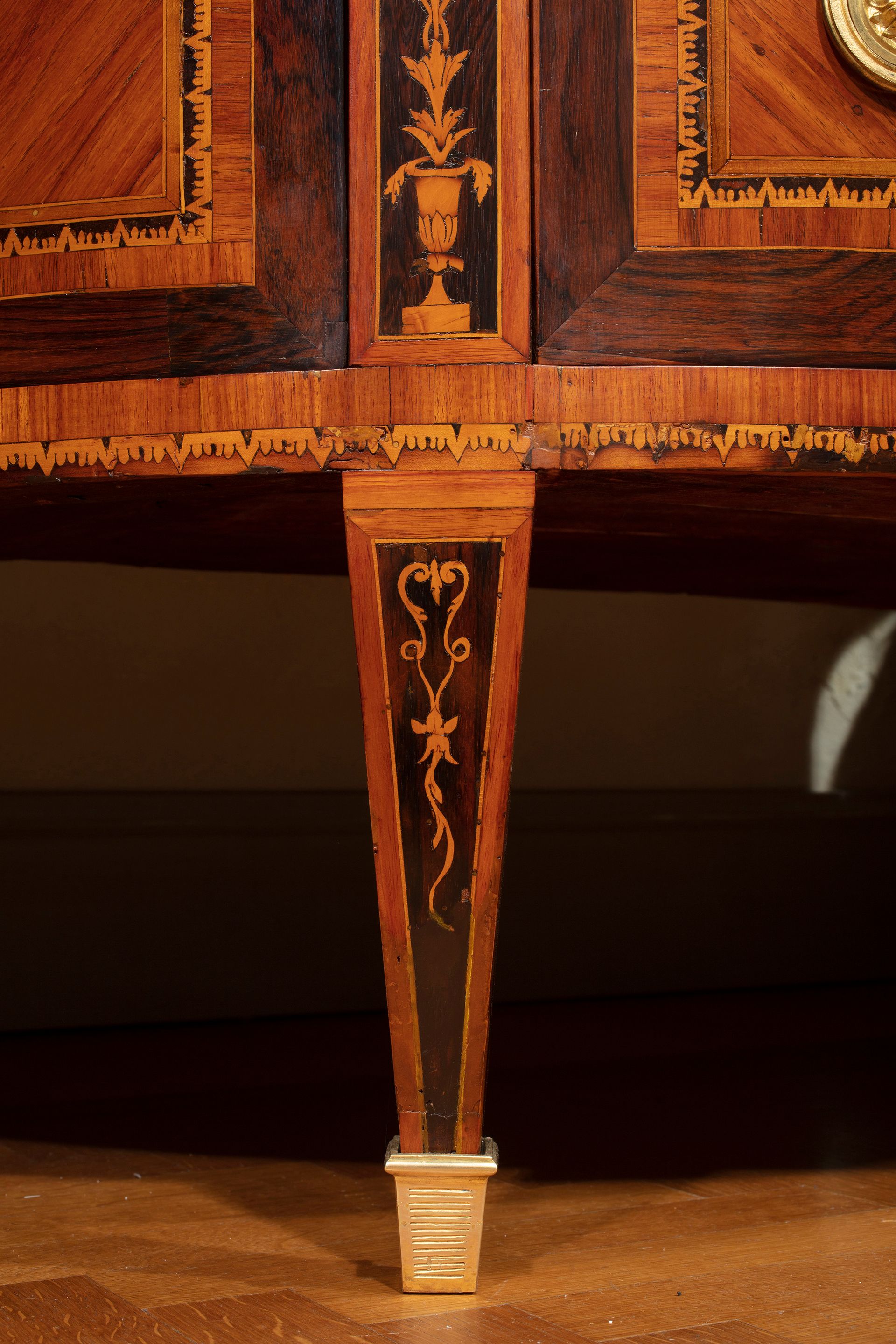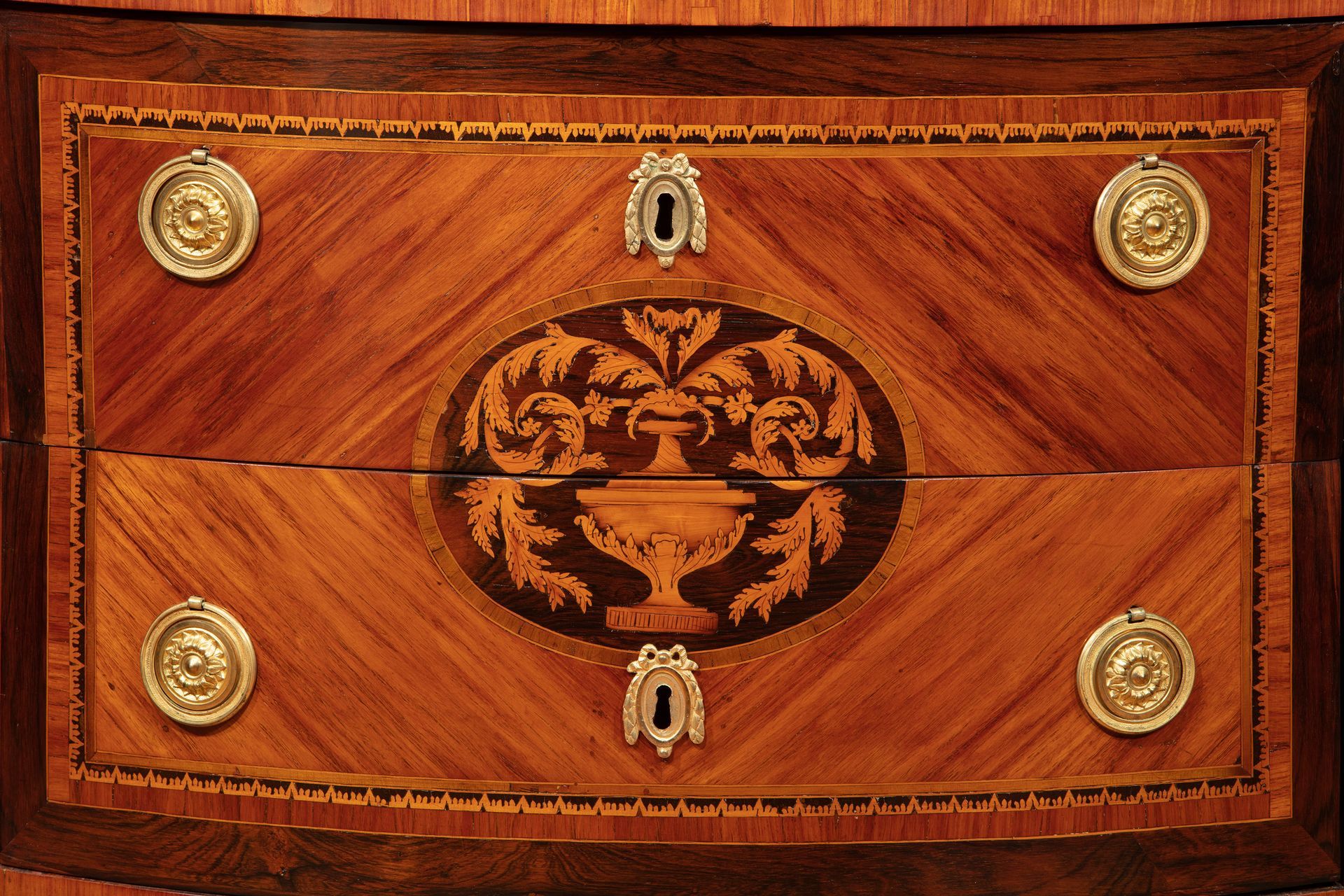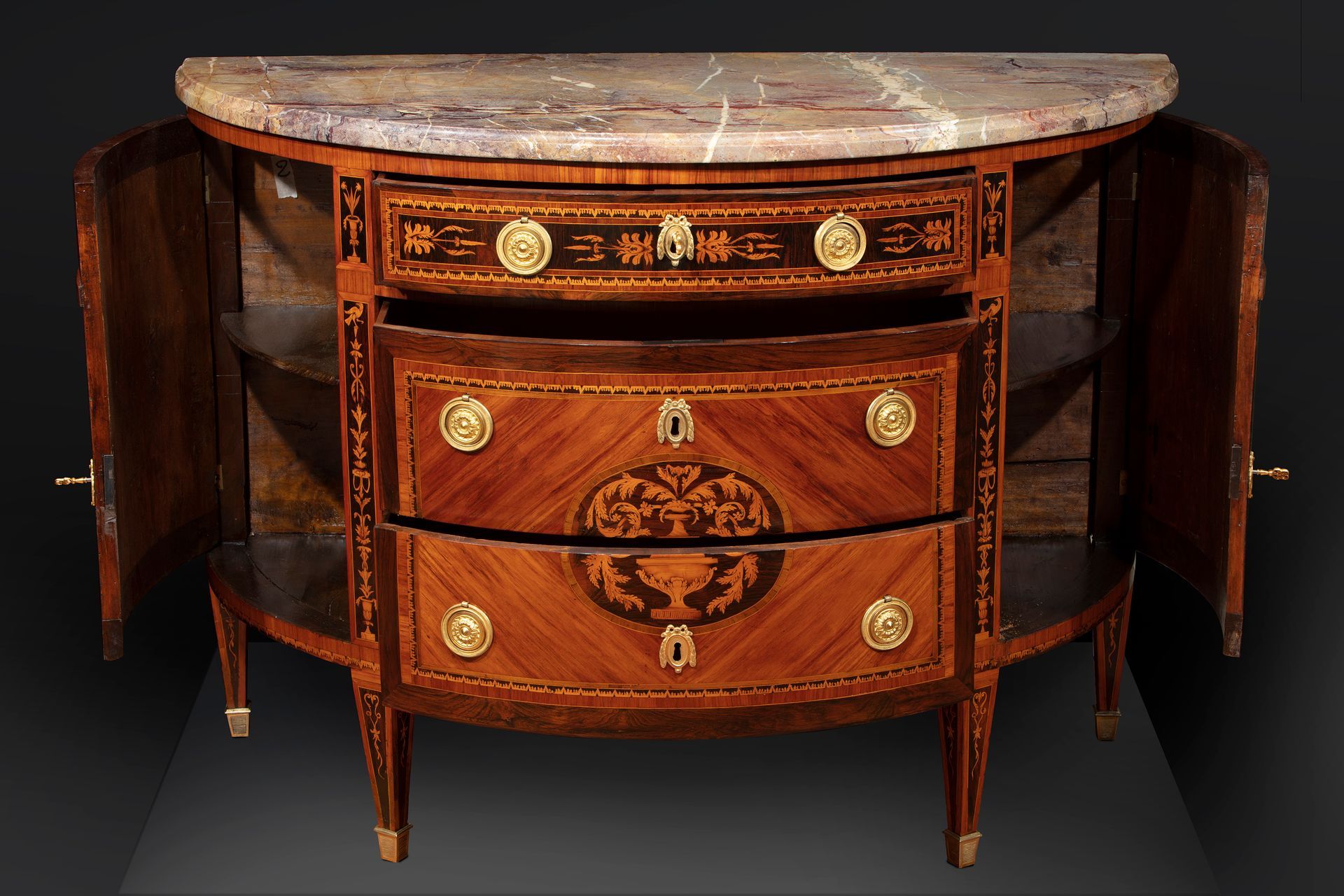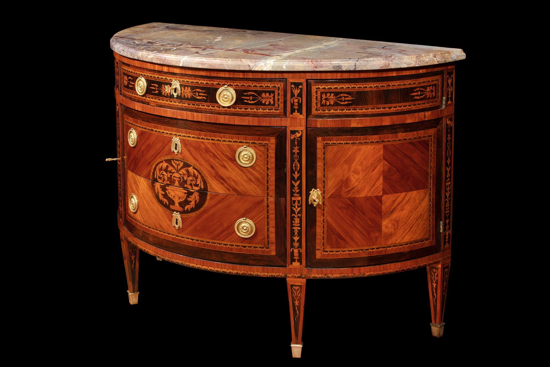 La coppia di commodes, realizzare in pregiati legni, rappresenta un raffinato esempio di manifattura lombarda di fine Settecento. La particolare forma bombata dona al mobile volume, mentre il piano in marmo ocra, con le sue venature grigie e scarlatte, crea un contrasto coi toni caldi del legno di noce. Al centro, i delicati intarsi raffigurano coppe ricolme di foglie d’acanto e motivi geometrici; sui due cassetti laterali apribili figurano delle stringhe decorative di motivi vegetali, che culminano con uccelli dal becco uncinato, forse aquile. Le gambe hanno forma piramidale.