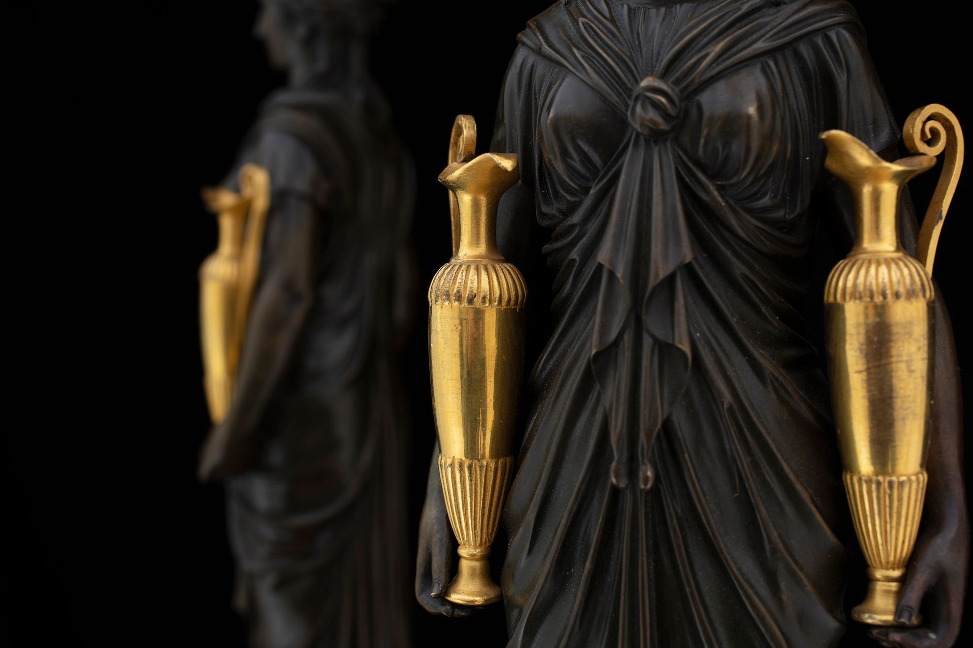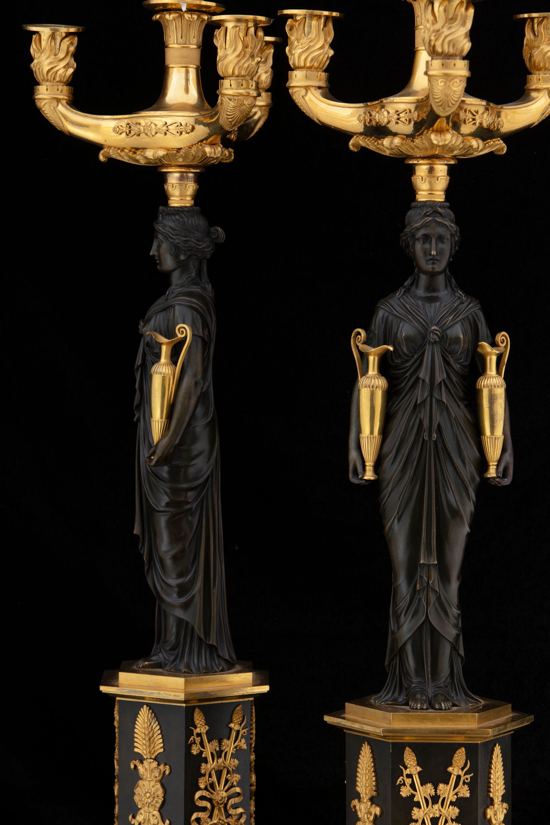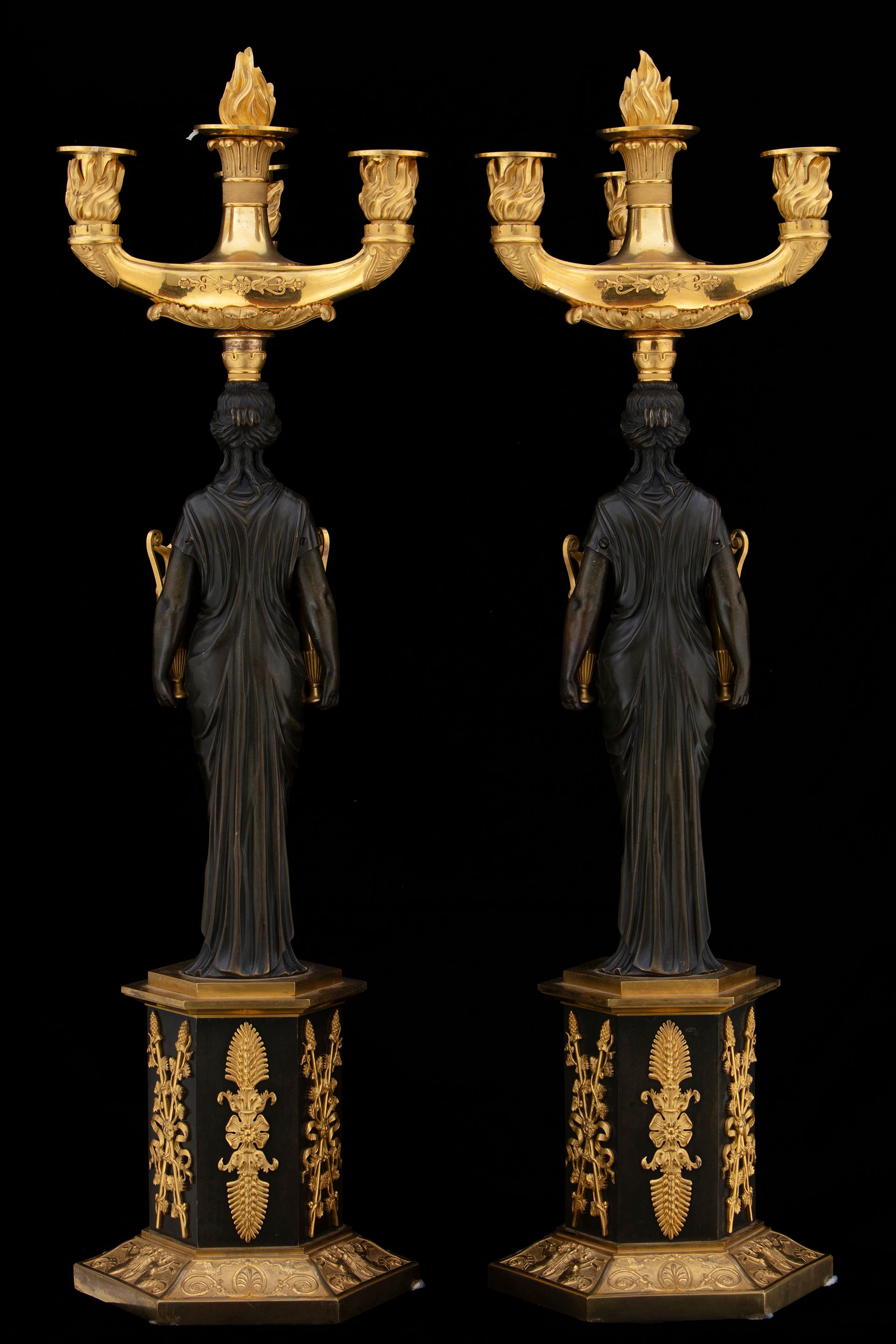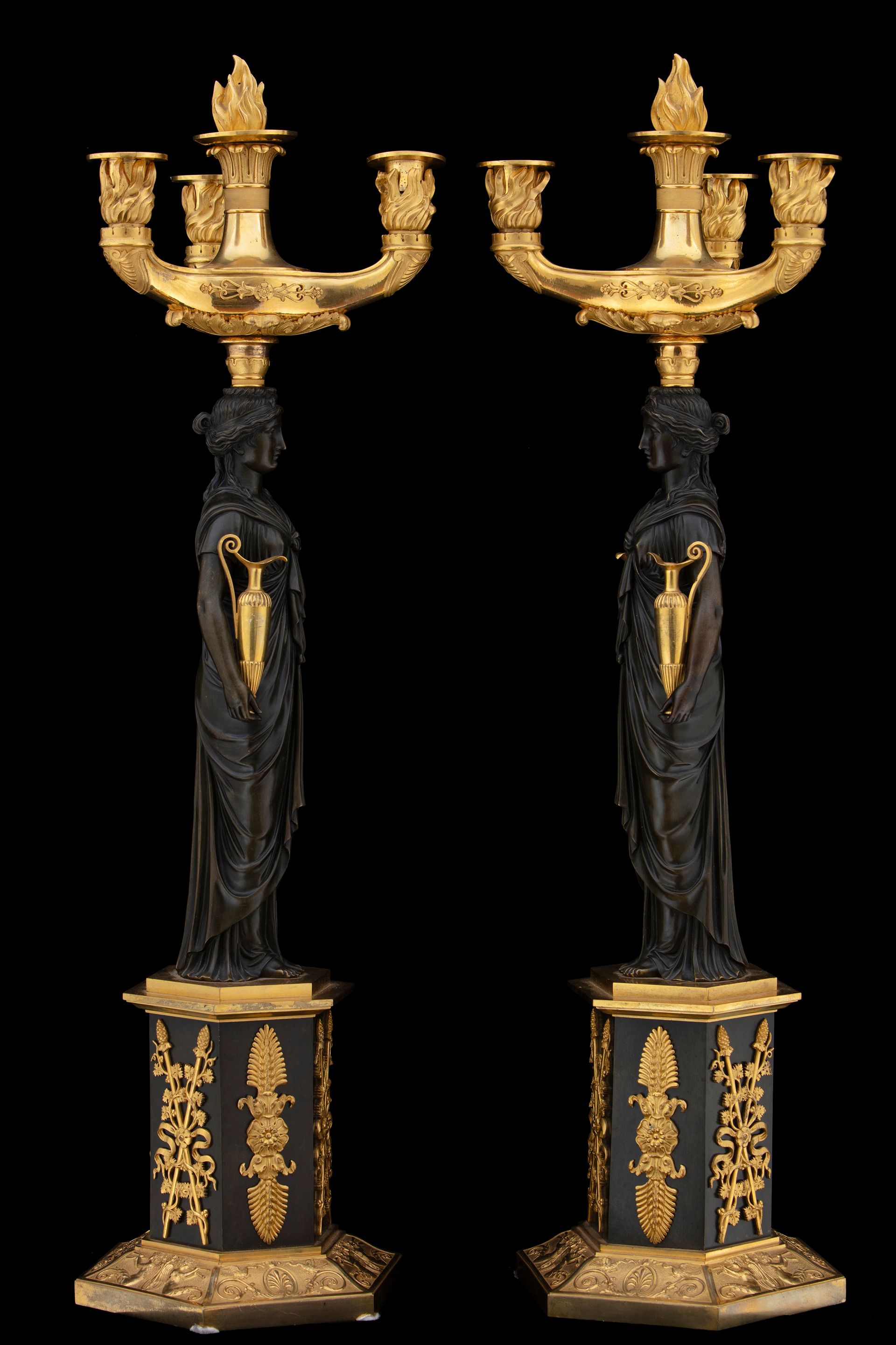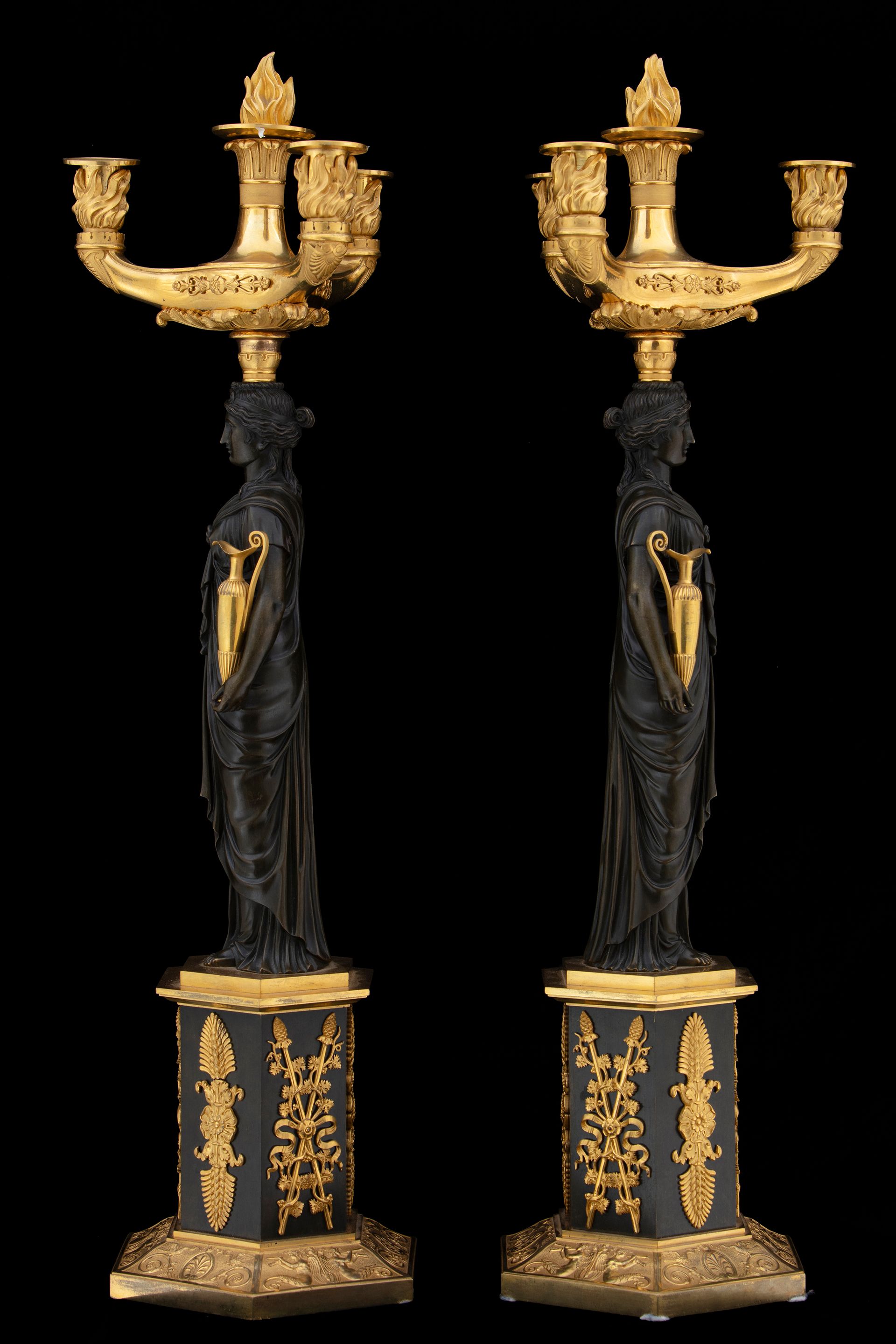 Questa coppia di eleganti candelabri presenta diversi elementi interessanti. Il corpo è costituito dalla figura di una vestale, in bronzo brunito, che regge due brocche in bronzo dorato. La parte superiore, costituita dai bracci portacandela, è realizzata in bronzo dorato ed è riccamente ornata: fregi applicati e palmette cesellate abbelliscono la struttura, mente i portacandela sono avvolti da torce fiammeggianti. Un quarto braccio decorativo riprende il tema e presenta una sorta di fiaccola.