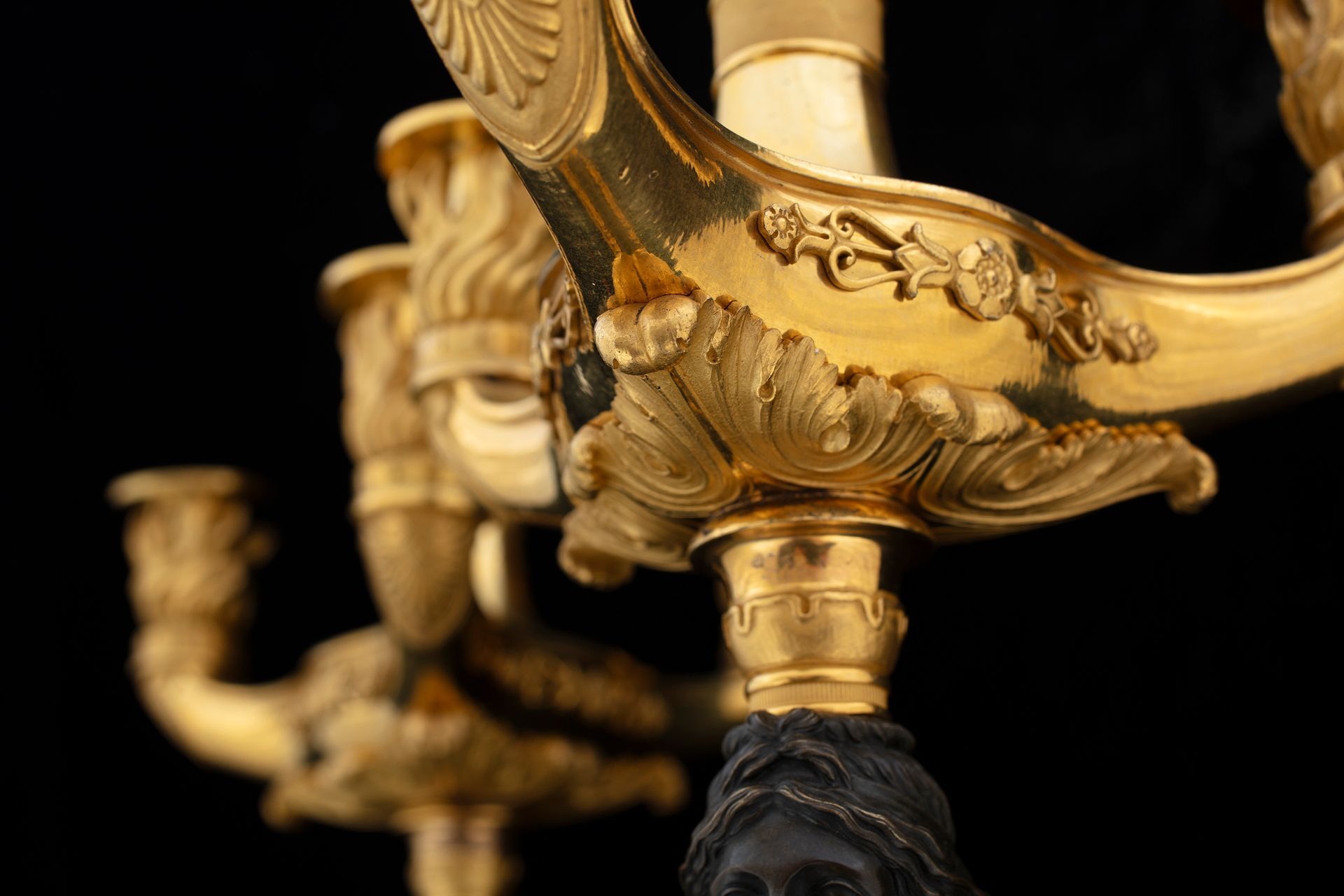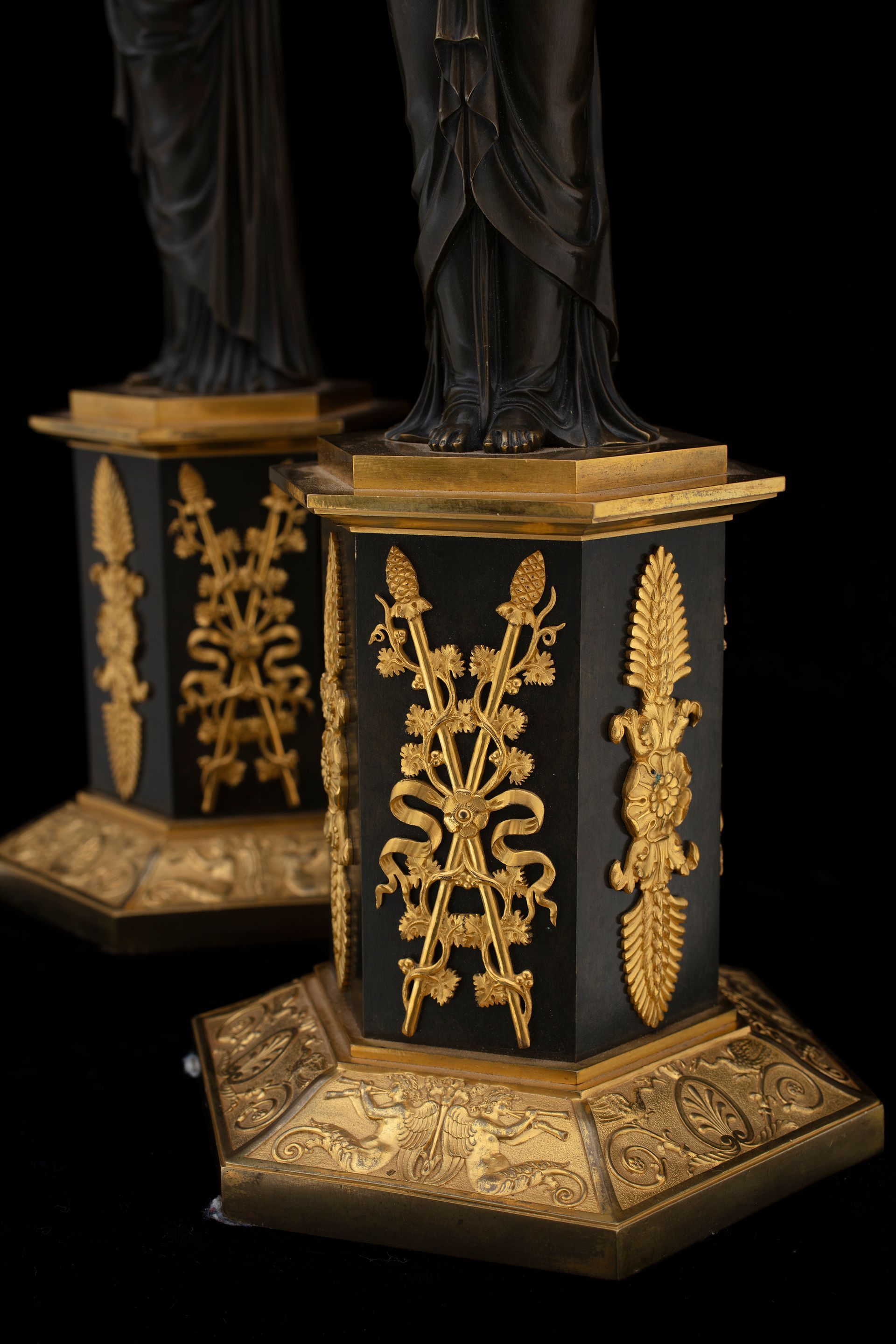 Coppia di candelabri Impero in bronzo brunito e dorato al mercurio, prima metà del XIX secolo.