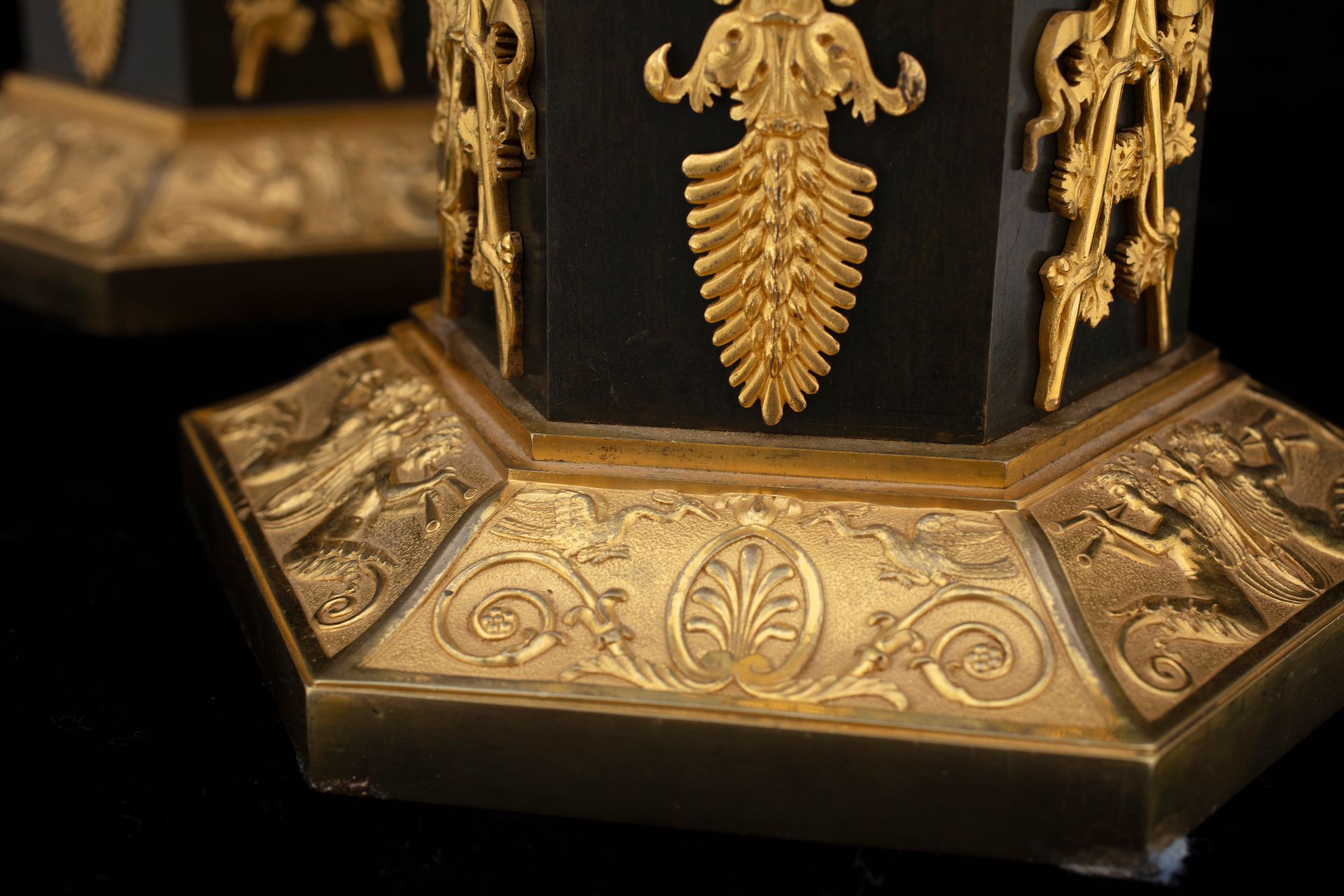I candelabri poggiano su un piedistallo a prisma esagonale impreziosito da fregi con elementi floreali, vegetali e palmette.