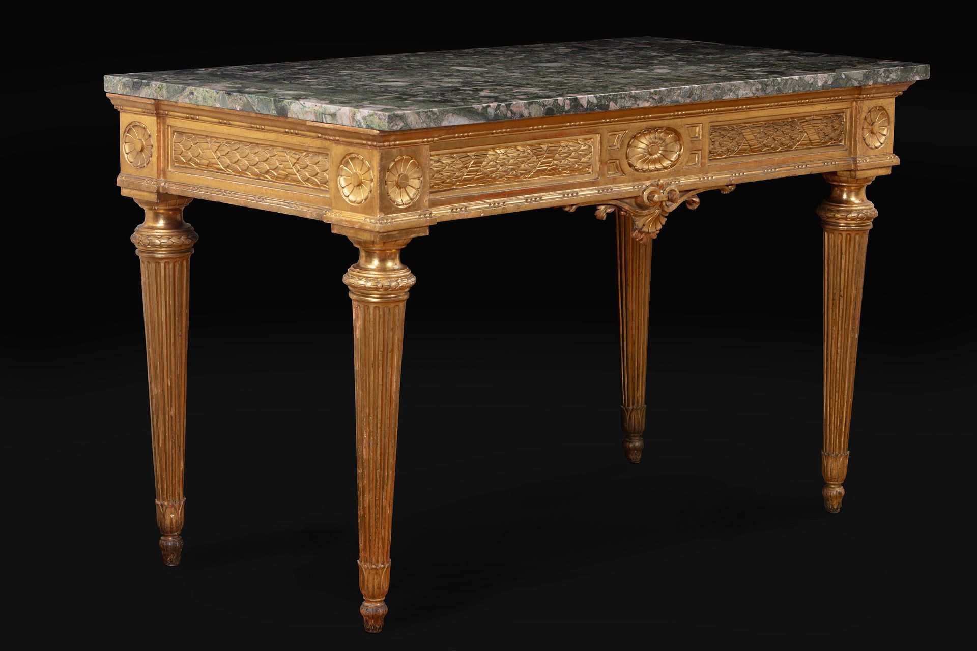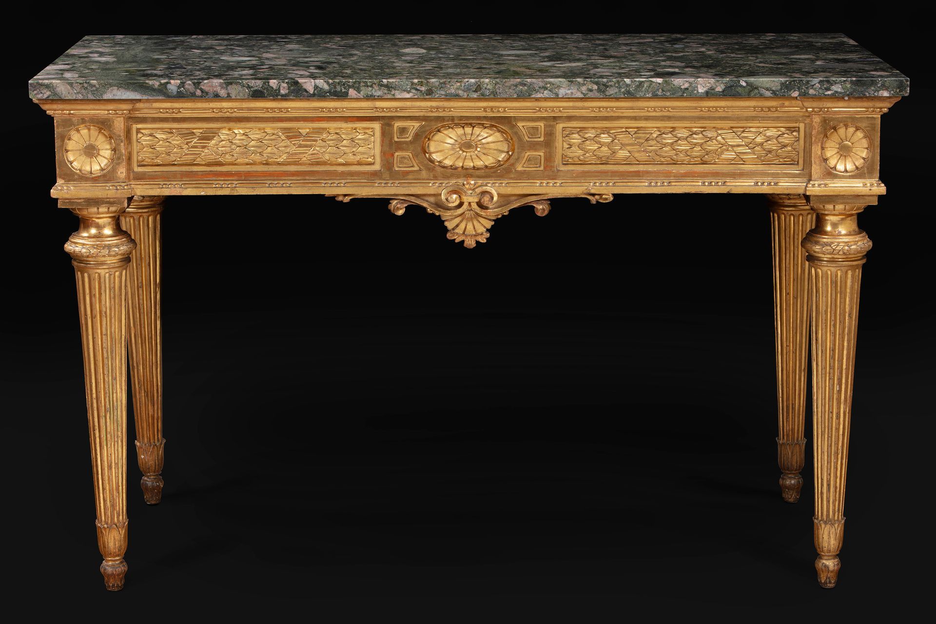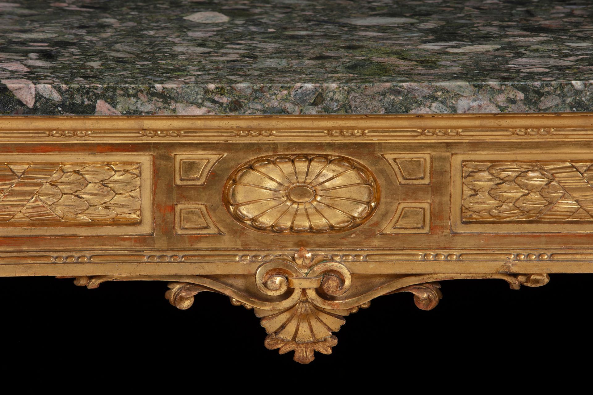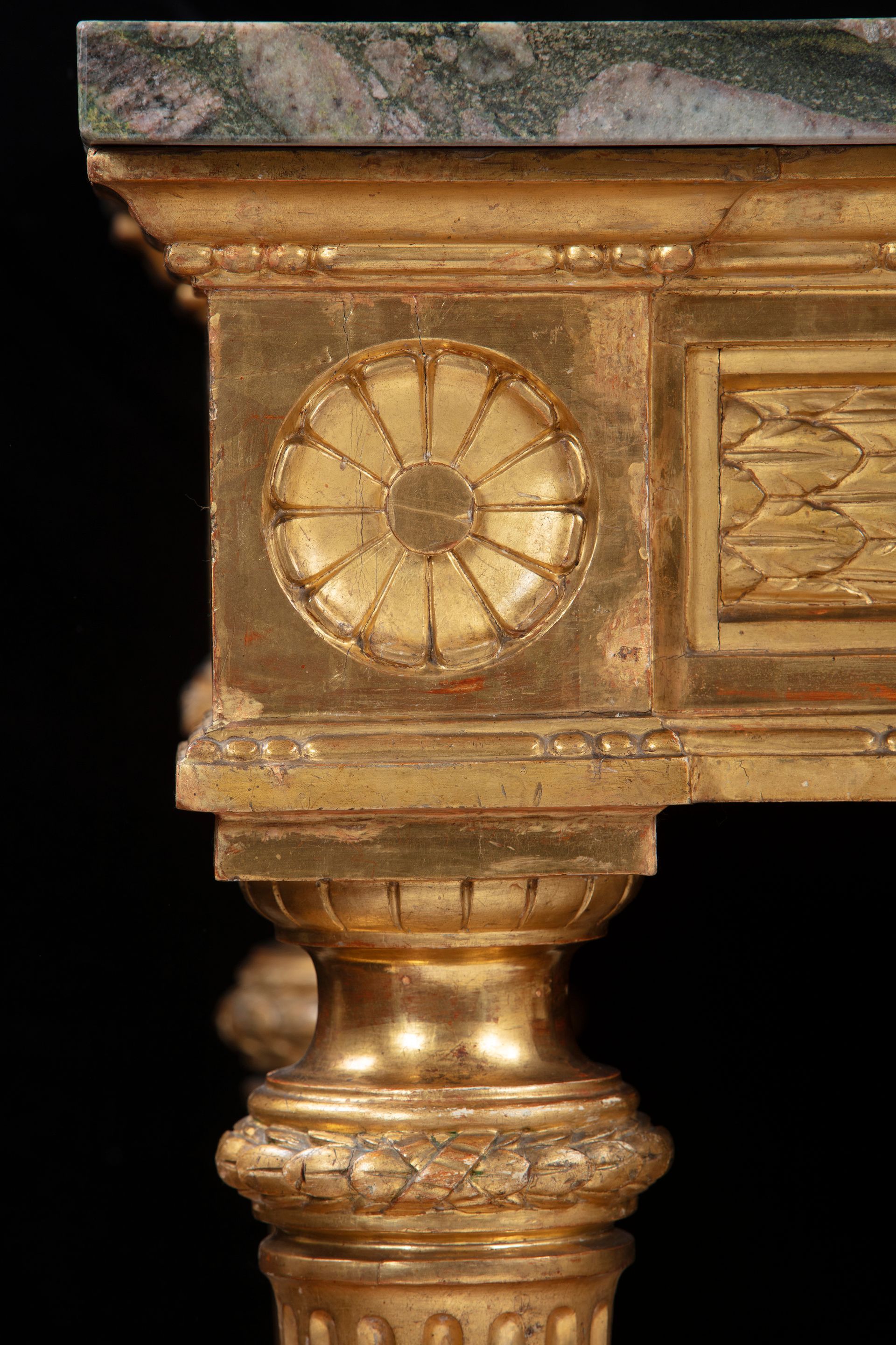 Coppia di eleganti consolles parietali in legno dorato e scolpito con piano in granito Clasti, Epoca Luigi XVI.