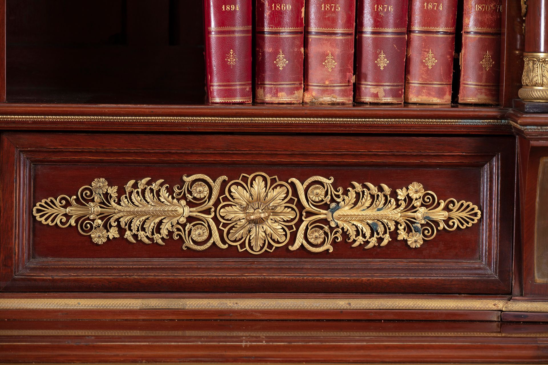 La coppia di mobili è ornata da numerose decorazioni in bronzo dorato e finemente cesellato con palmette e fregi a motivo vegetale nella parte superiore e inferiore agli scaffali e altri decori in bronzo sugli angoli della facciata. L’elaborata decorazione in alto presenta al centro una maschera e ai lati decori floreali e vegetali estremamente dettagliati.