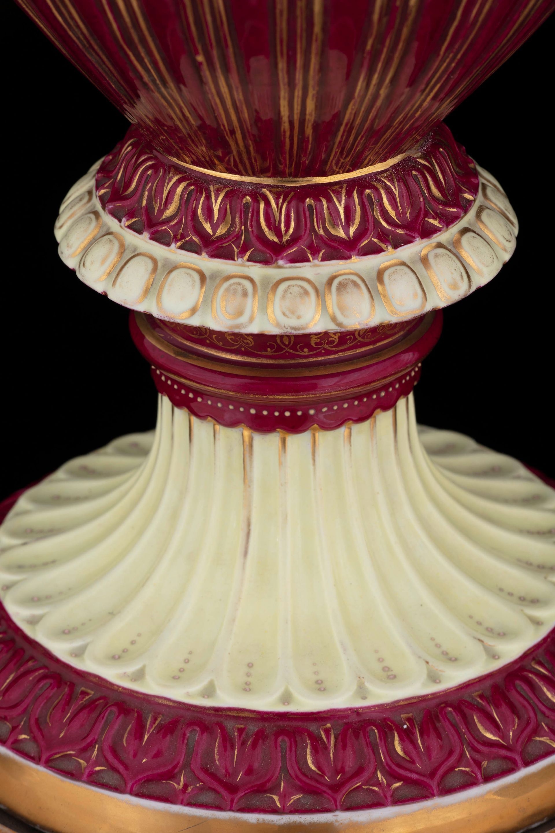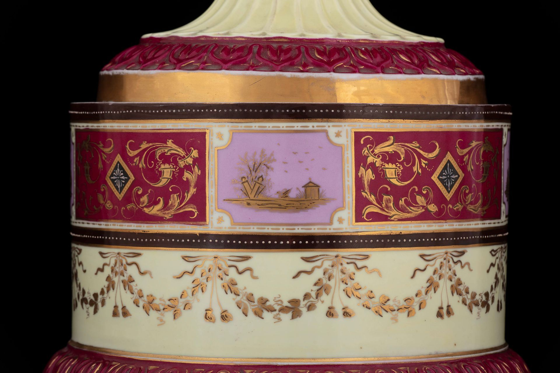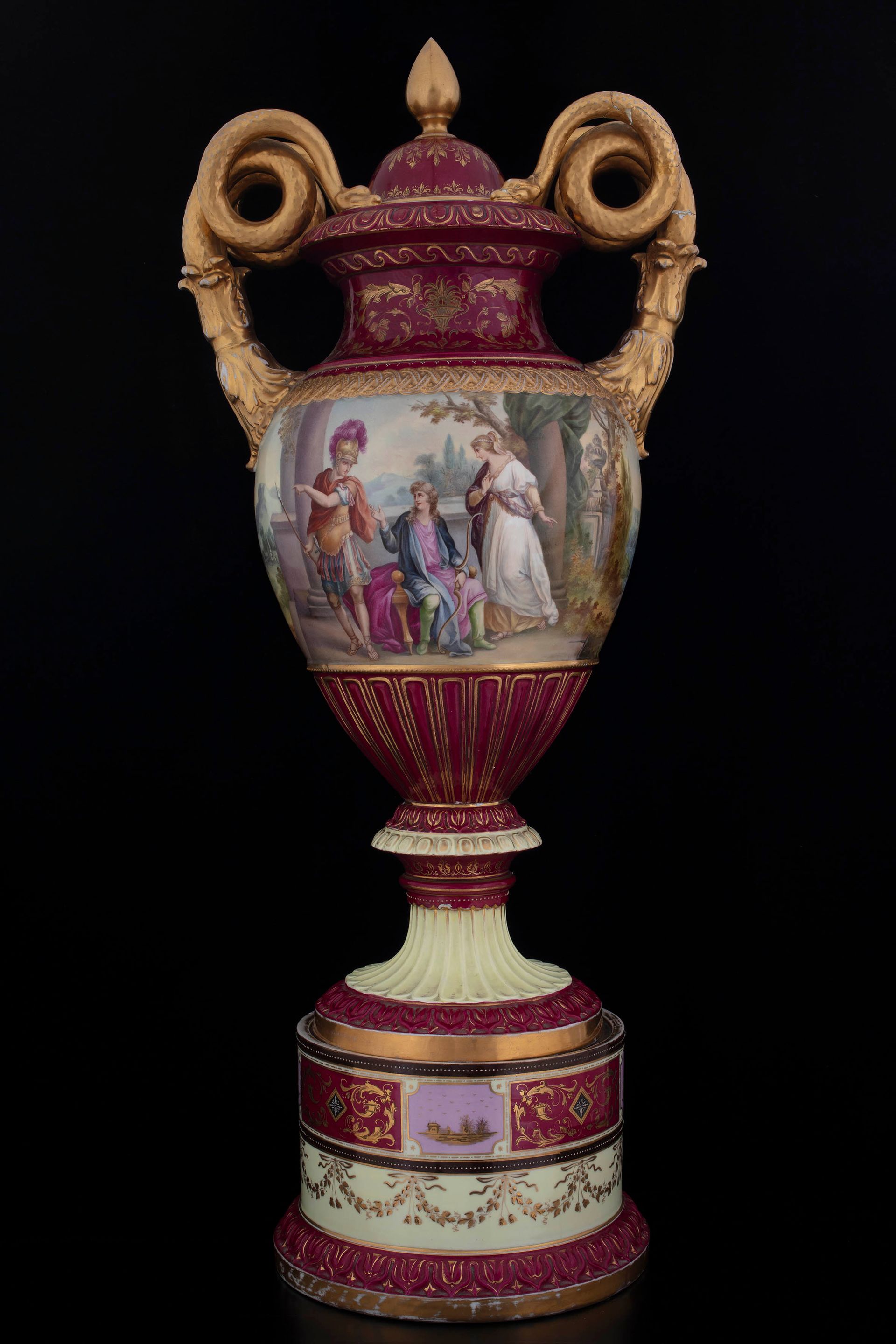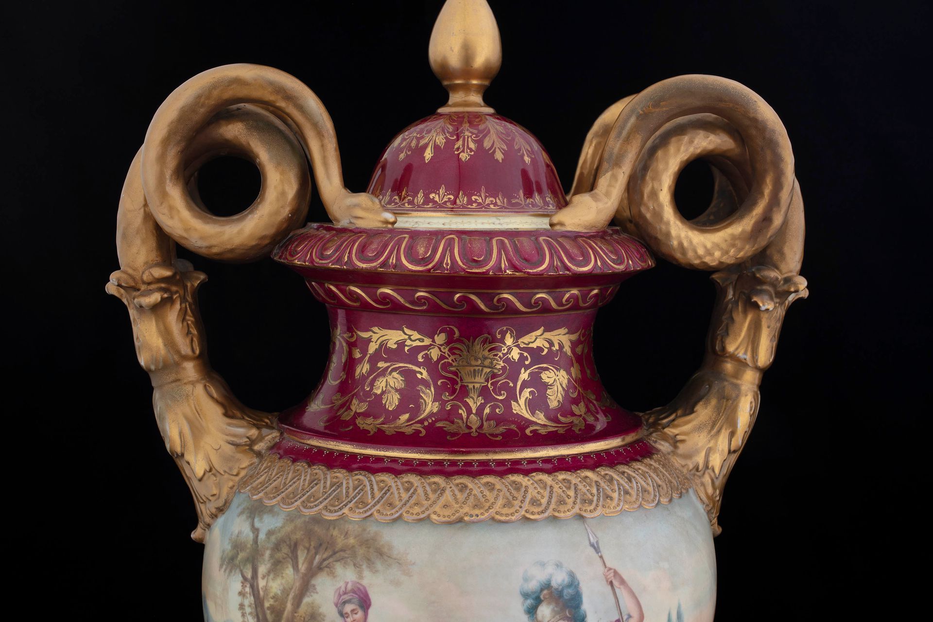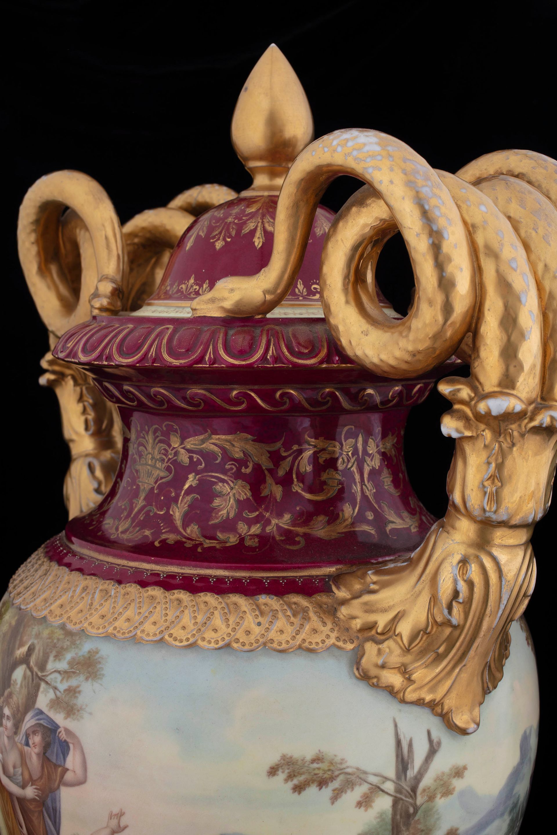 Questa splendida coppia di grandi urne in porcellana dipinta si caratterizza per la qualità delle decorazioni che presenta: due scene classiche, finemente realizzate e ricche nei dettagli, occupano il corpo dei vasi sia sul fronte che sul retro. I vasi e il loro coperchio si presentano in un rosso intenso, impreziosito da elaborate decorazioni dorate. I manici sono zoomorfi: due serpenti dorati avvolgono le proprie spire creando una solenne impugnatura. I vasi poggiano su alti piedistalli, dipinti con temi fitomorfi e grottesche in oro, bianco e porpora.