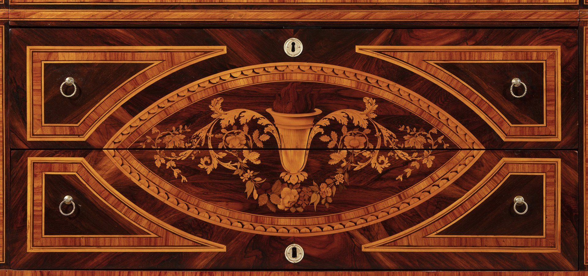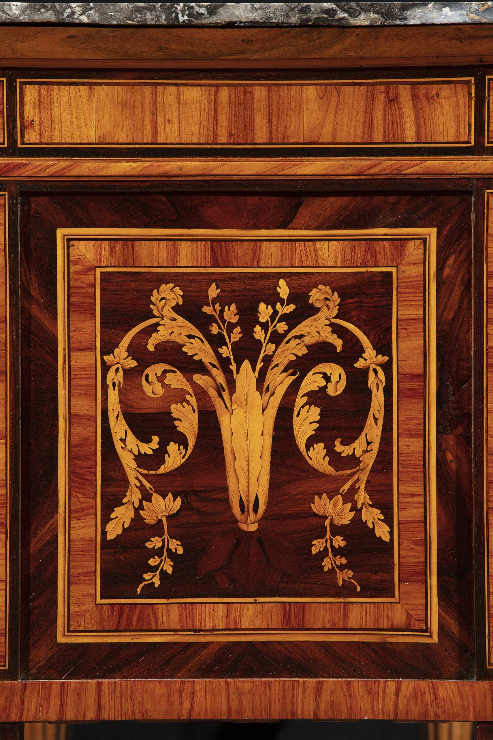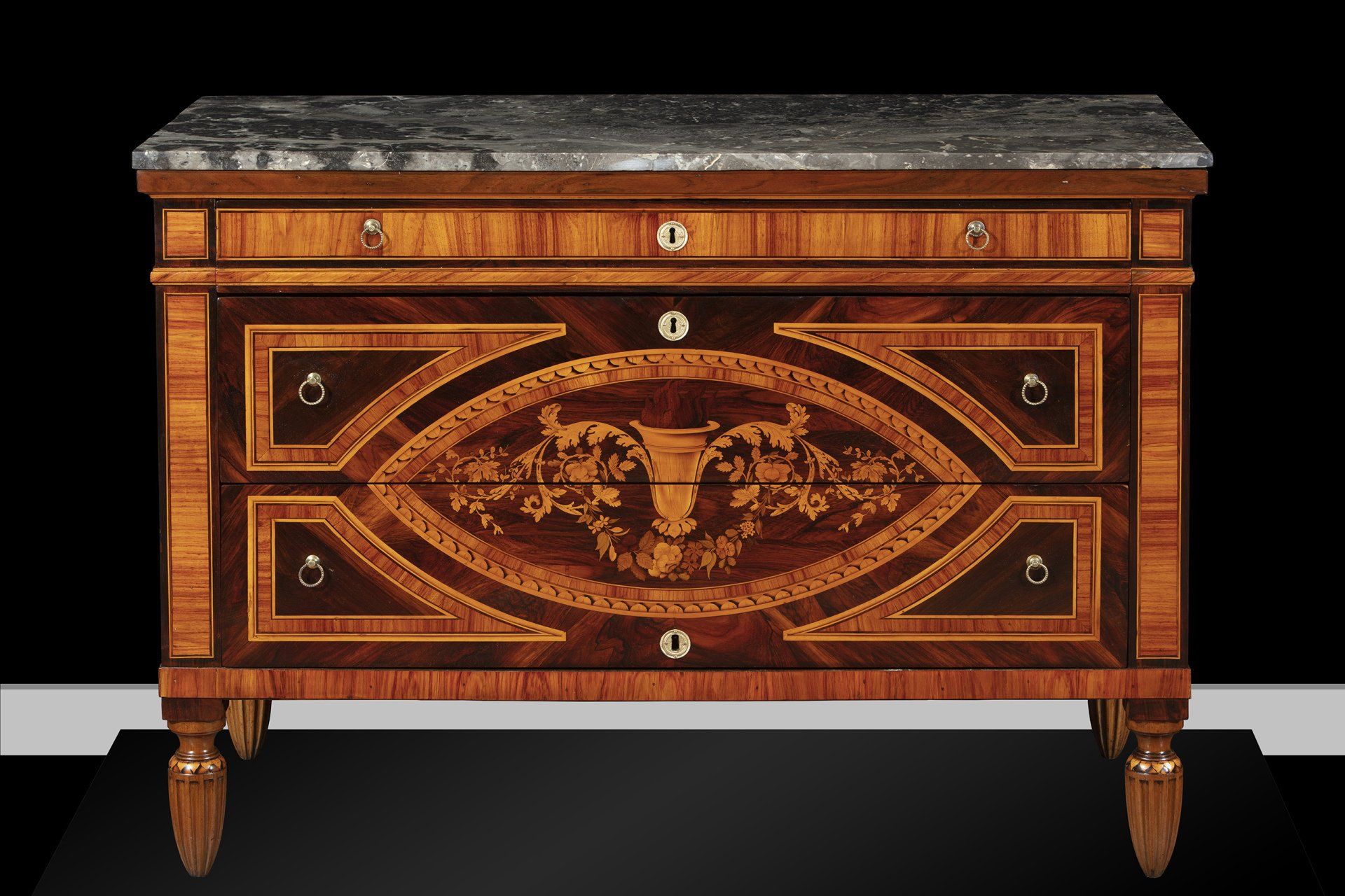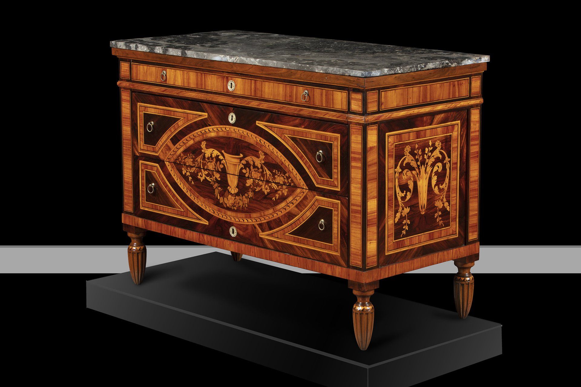 Chest of drawers inlaid with precious woods, marble top subtended by a thin drawer and two large drawers decorated with a neoclassical motif within geometric reserves, the sides also inlaid with raceme motifs, walnut wood feet in the shape of a grooved spindle.