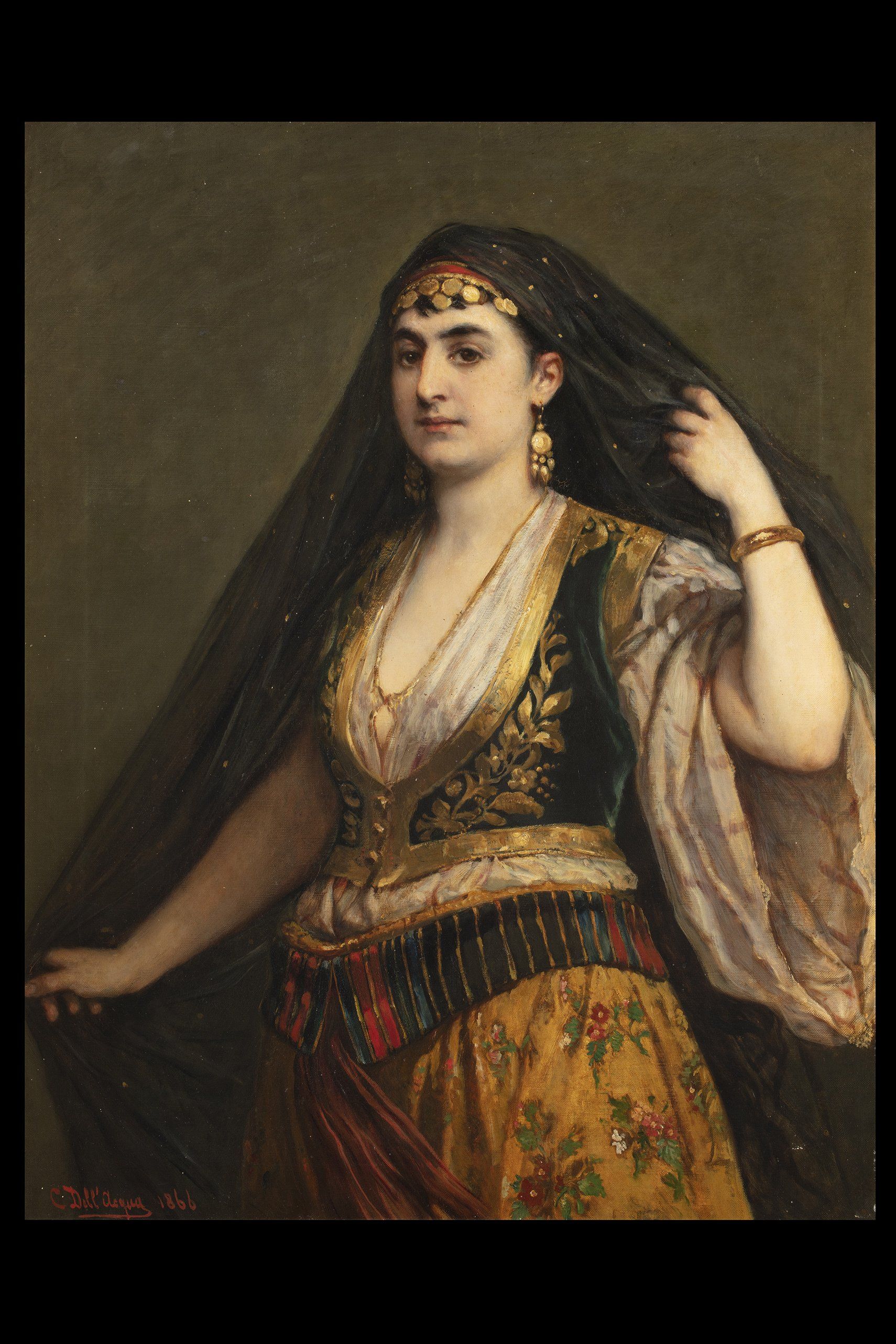 Oil on canvas depicting a girl (Odalisque) in oriental dress.