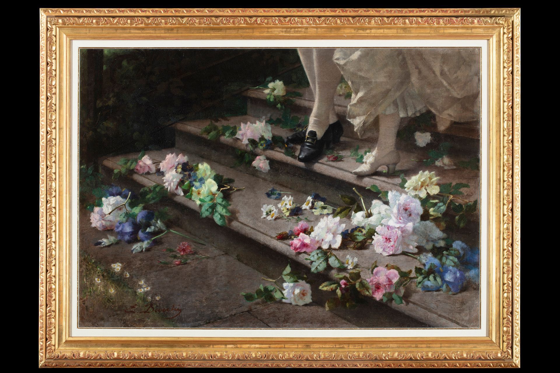 La tela raffigura un’inconsueta natura morta: anziché sistemate ordinatamente in un vaso, margherite, viole e rose dai colori tenui si trovano sparpagliate sopra i gradini di una scalinata. Bucchi, rinomato per le sue nature morte di fiori delicate e vivide, sceglie qui di rappresentare anche la figura umana, che è però quasi d’intralcio al vero soggetto. In uno scherzoso gioco di prospettiva, l’artista mozza le figure dei due novelli sposi a cui, usciti dalla chiesa, vengono lanciati mazzi di fiori, mostrandone solo il corpo dalle ginocchia in giù.
