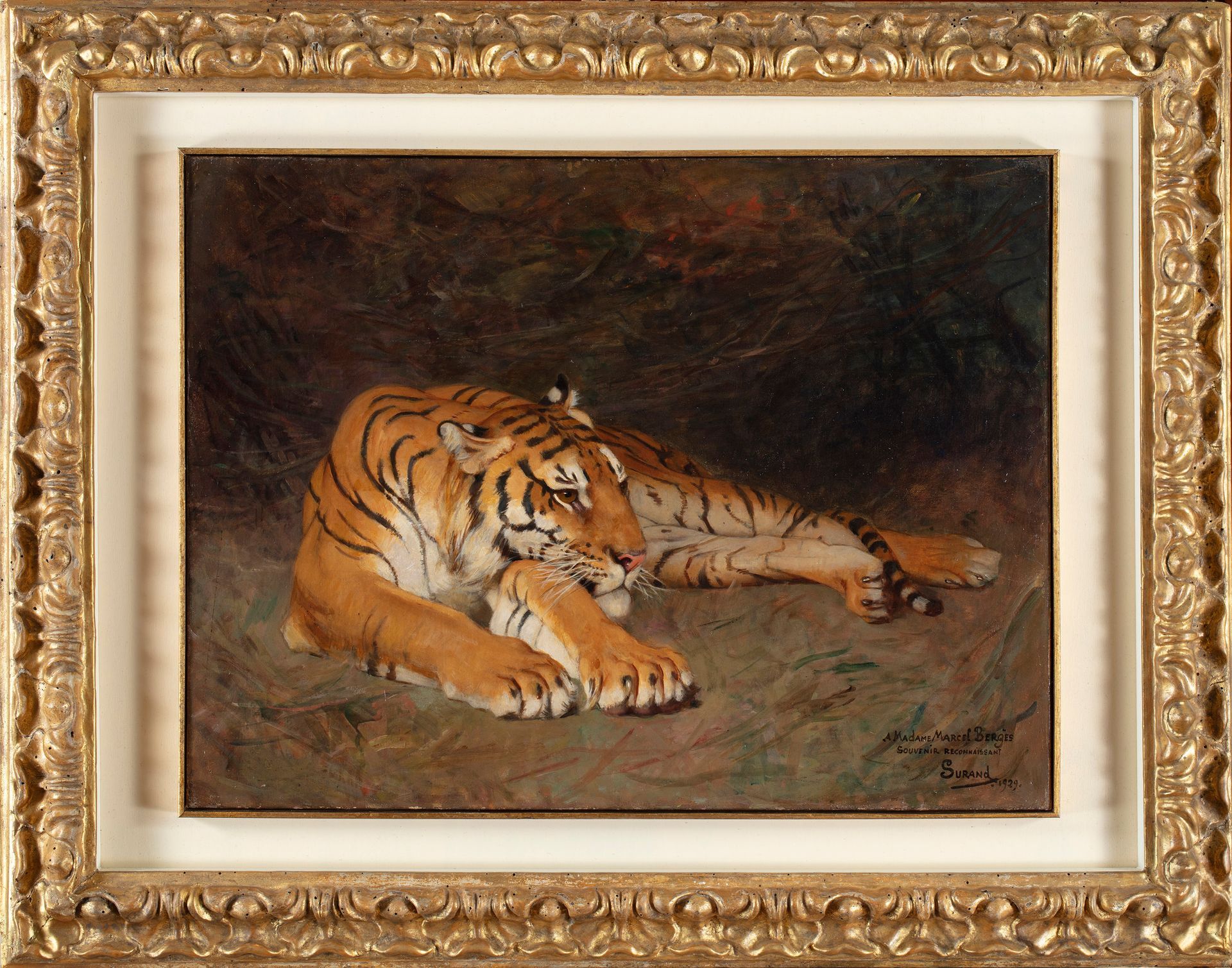 Tigre a riposo di Gustave Surand è una tela raffigurante un grosso felino, sdraiato placidamente sul terreno. Si tratta di uno dei soggetti prediletti dell’artista, affascinato dalla natura e dai grandi mammiferi come tigri e leoni, ritratti spesso a riposo, come in questo caso. La tigre di questo dipinto si staglia su uno sfondo in cui prevalgono bruni e terre, e da cui spuntano saltuariamente lunghe e larghe pennellate di colori puri, distinguibili in sfumature di verdi freddi e rossi. Il pittore con marcato realismo riesce a rendere la forza dell’animale, sia concreta che nella sua accezione più astratta. La tigre è un essere tanto diverso dall’uomo, procede per istinti, anziché per intelletto; tuttavia però, è guidata dallo stesso spirito di sopravvivenza, che accumuna tutte le creature. I felini di Surand non sono soltanto una resa quasi fotografica delle belve, ma aprono ad un’indagine profonda della psiche, su cui l’artista si interroga; è una visione assolutamente decadente, in cui l’essere umano è abbassato a creatura che con arrogante resilienza tenta senza tregua di superare e dominare ciò che lo circonda, anche a scapito dell’altro.
