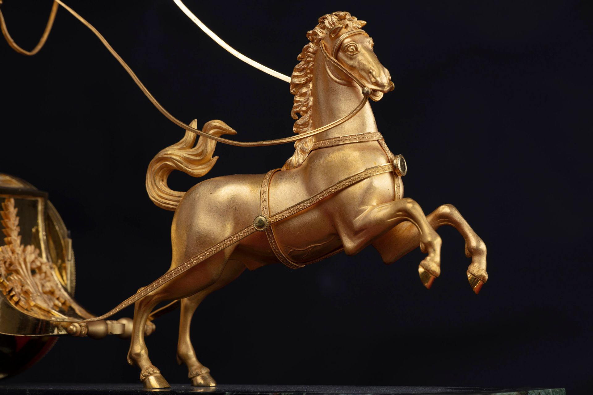 Realizzato in bronzo dorato e brunito, raffigura il Dio Amore su un piccolo carro, guidato da un cavallo; il destriero è immortalato nell’attimo in cui si inarca mosso dallo scoccare delle briglie. Dietro l’amorino è rappresentato un cigno, animale associato alla Musa della poesia Erato e dunque un rimando alla lirica amorosa. Il basamento in marmo è decorato da arco e frecce e due falene, simbolo di Psiche, la fanciulla di cui si innamora Amore nel celebre mito.
