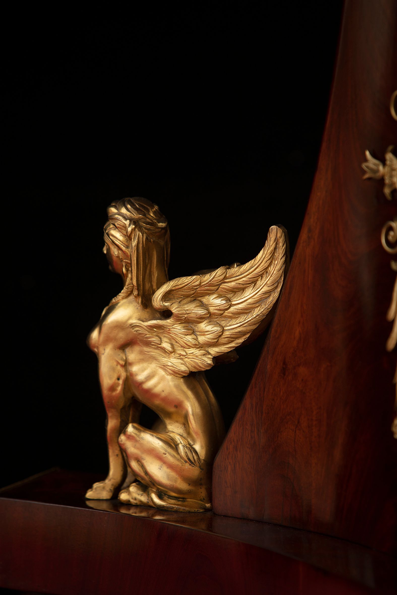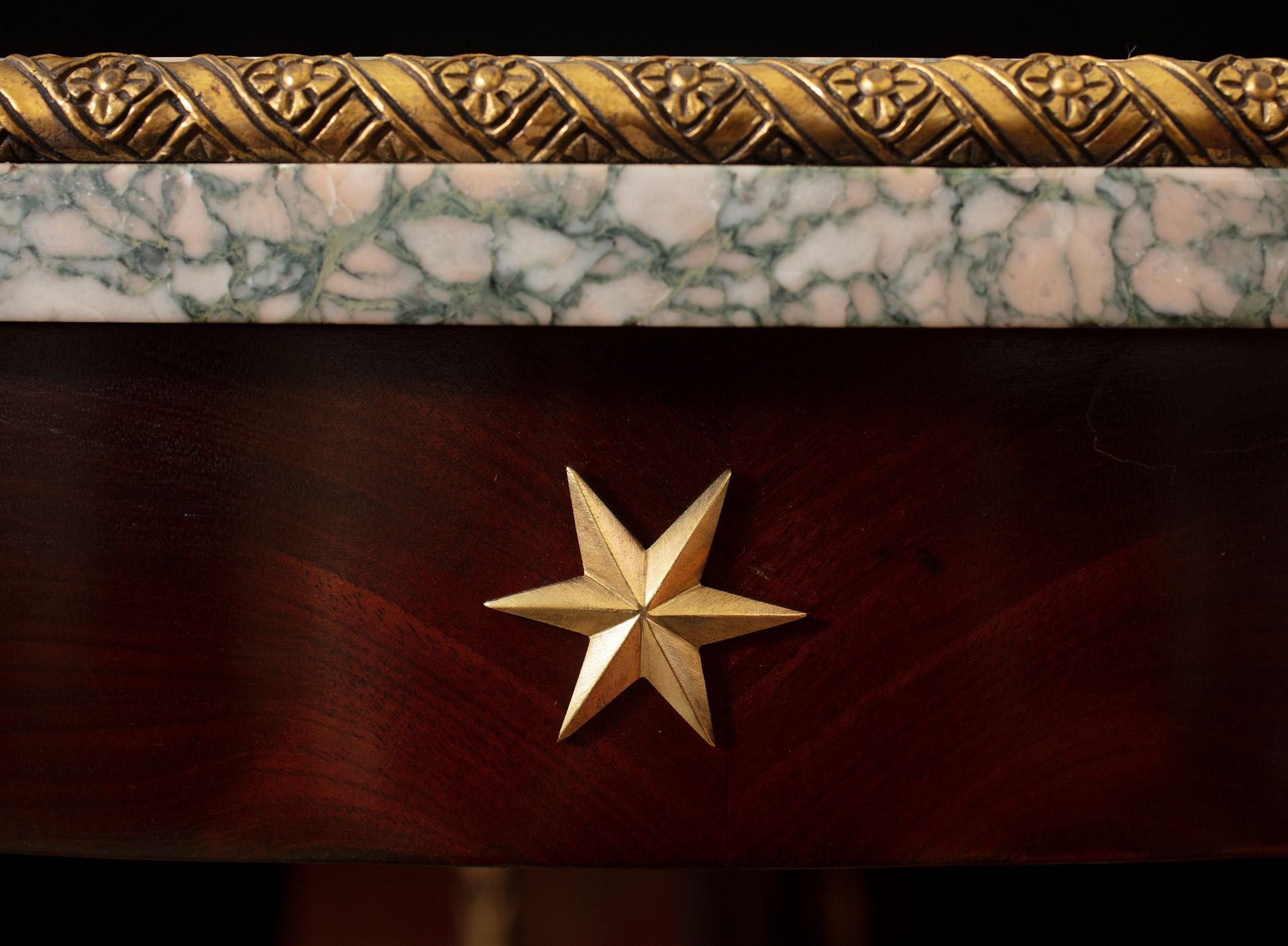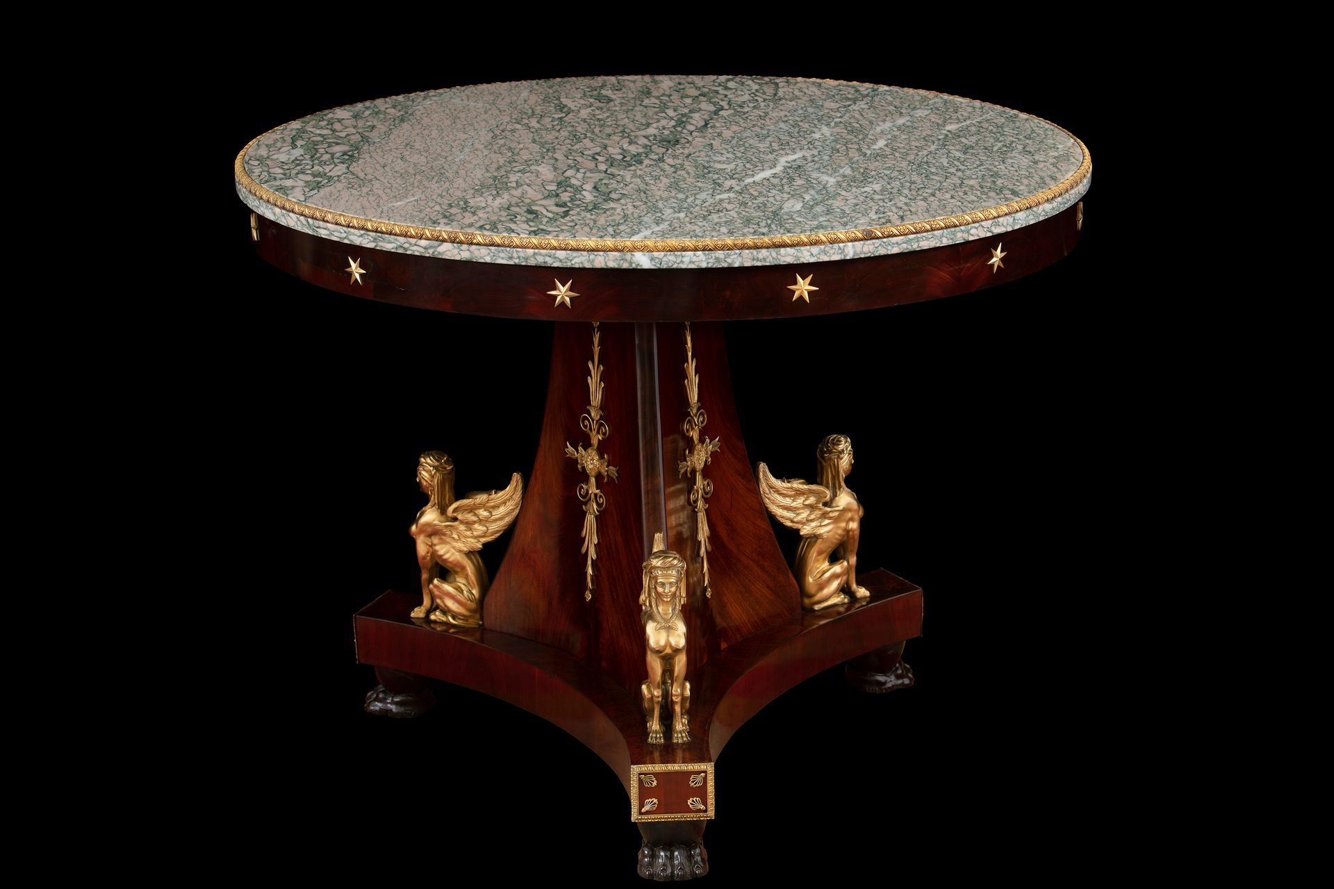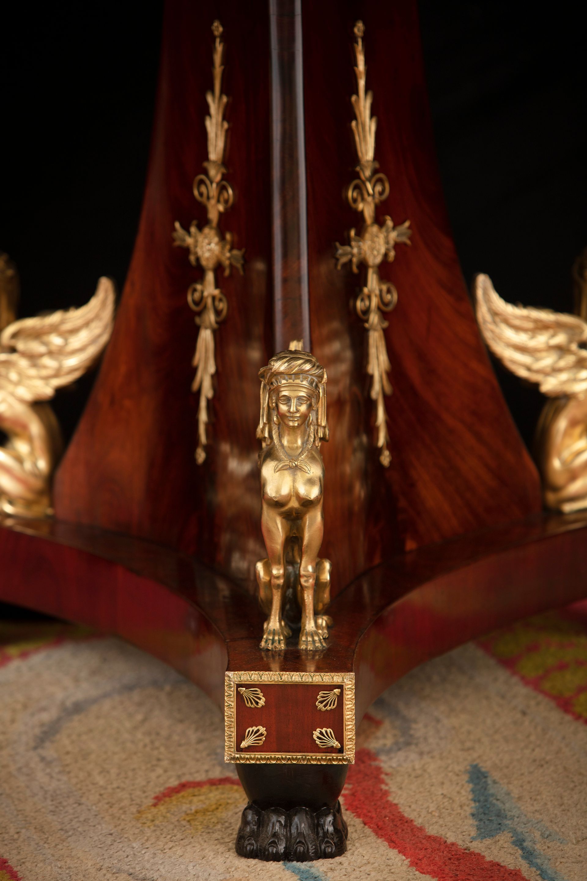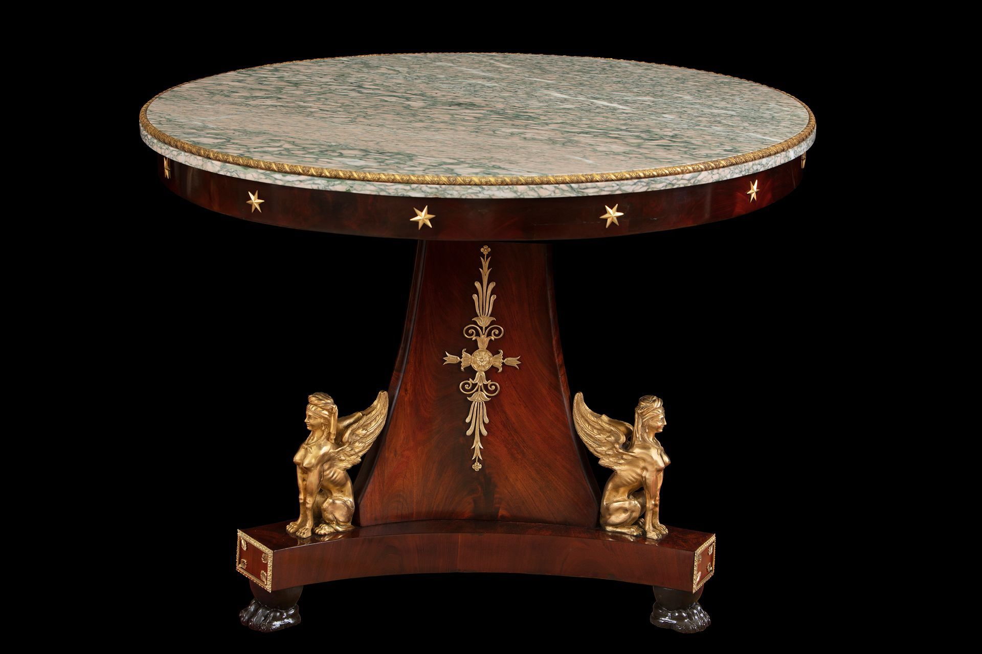 La fascia è decorata da stelle in bronzo dorato e la base trilobata è scandita da sfingi dorate finemente dettagliate e poggia su peducci ferini ebanizzati, sormontati da un decoro di fregi e palmette dorati.