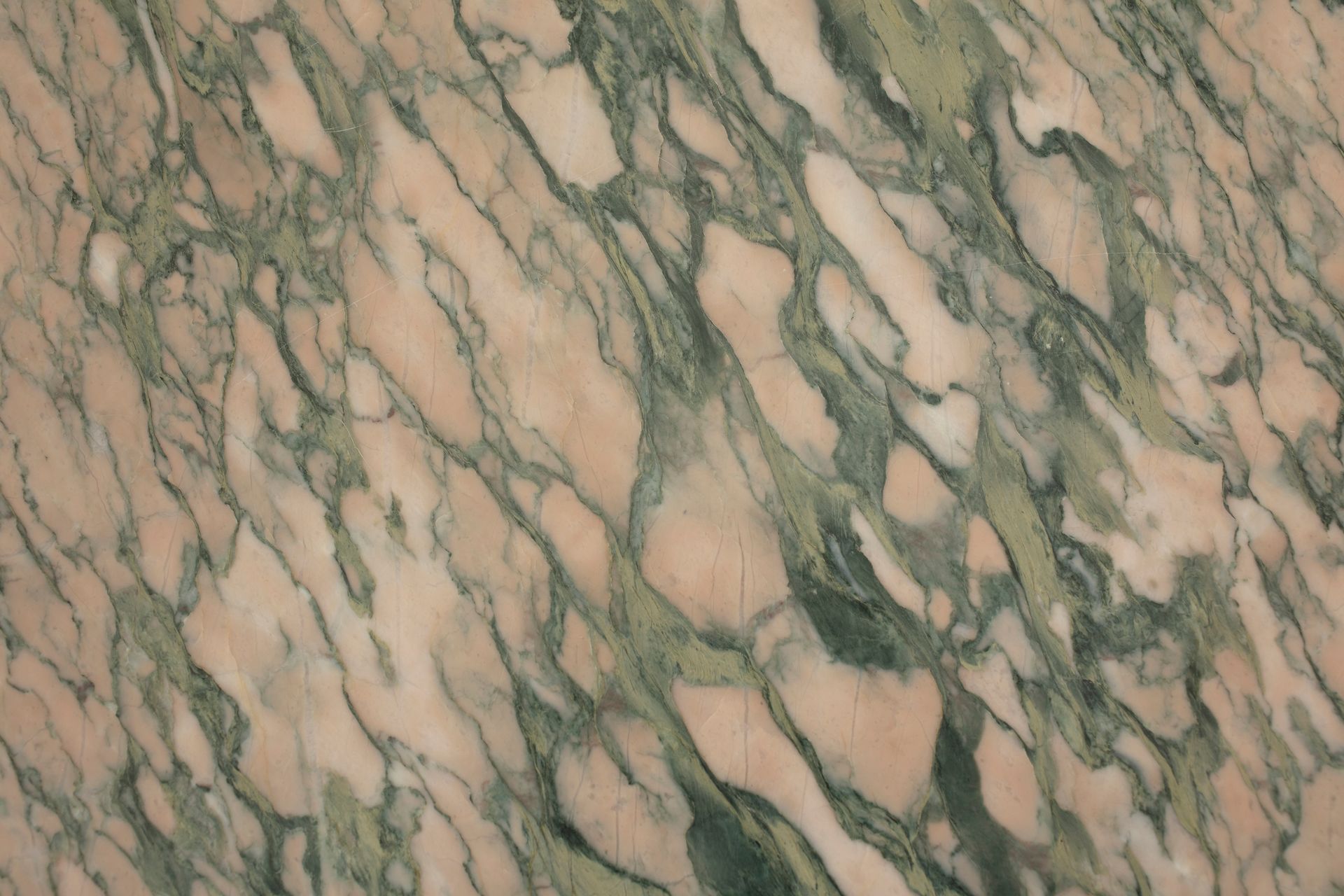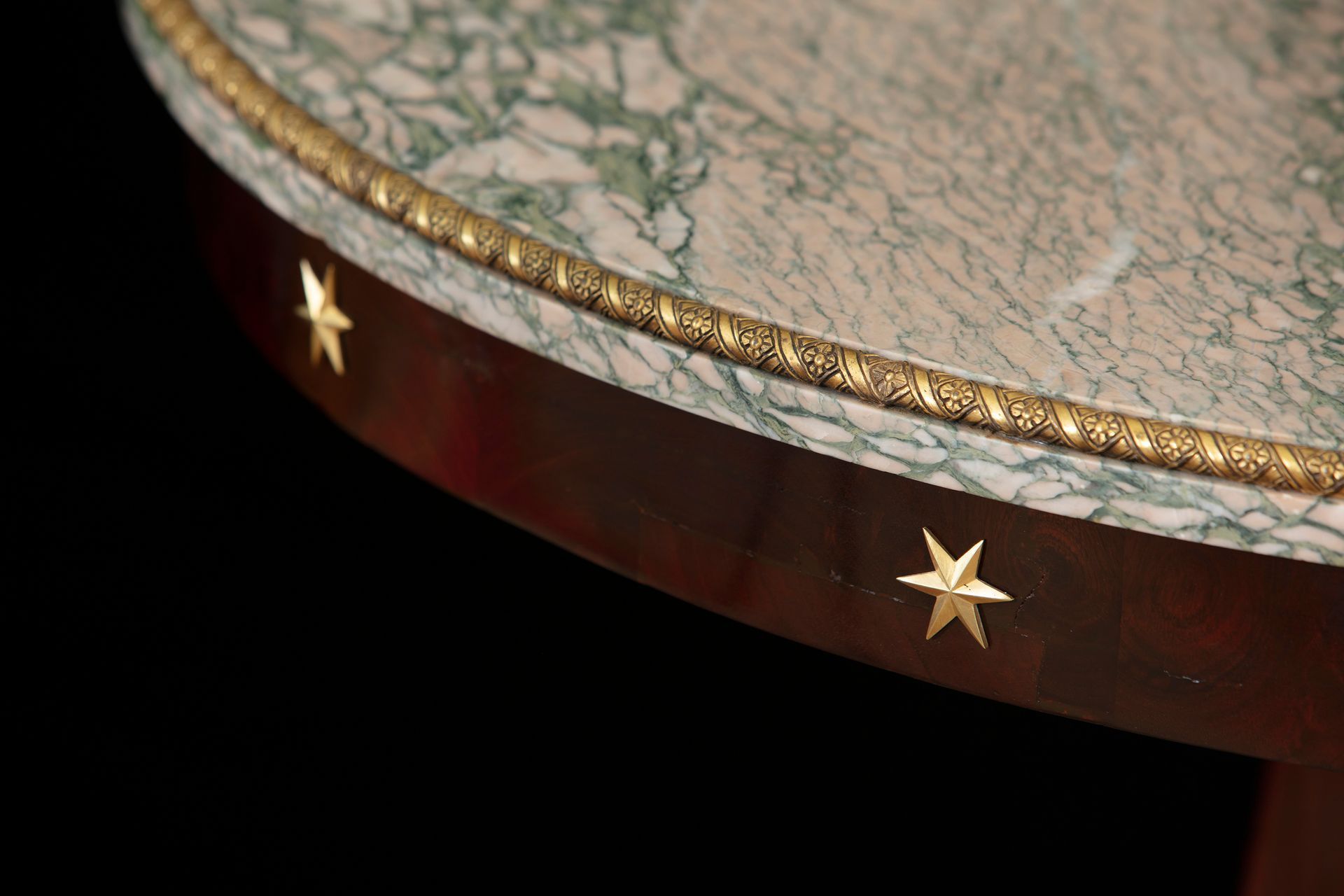 Il piano del tavolo, a forma circolare, è in un pregiato Payolle Vert, un elegante marmo di colore rosa chiaro con venature di un verde intenso; inoltre, il piano è profilato in bronzo dorato.